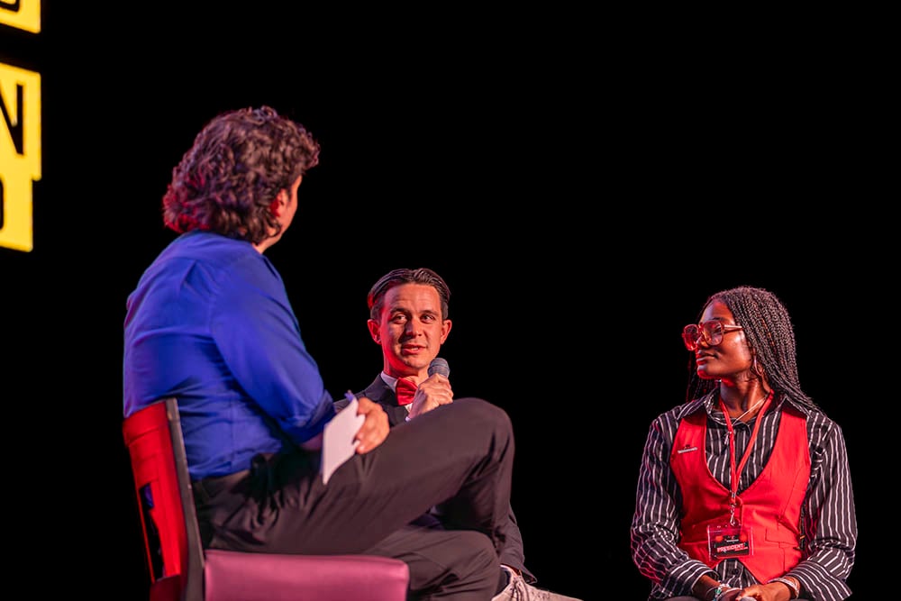 Host Matthew Stout speaks with Steven Owens, past president of TEDxGCU, and current president Madison Land. April 10, 2026. -