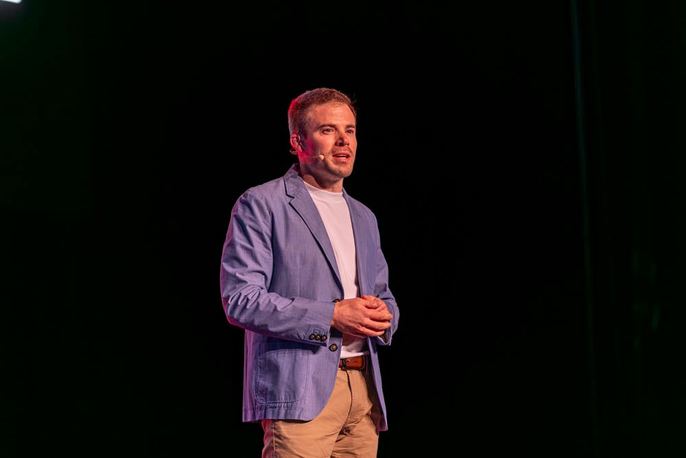 Dalton Jensen, a three-time NCAA championship coach, gave a TEDxGCU talk on "Expectation vs. Reality: The Human Desire for Contentment." April 10, 2026. -