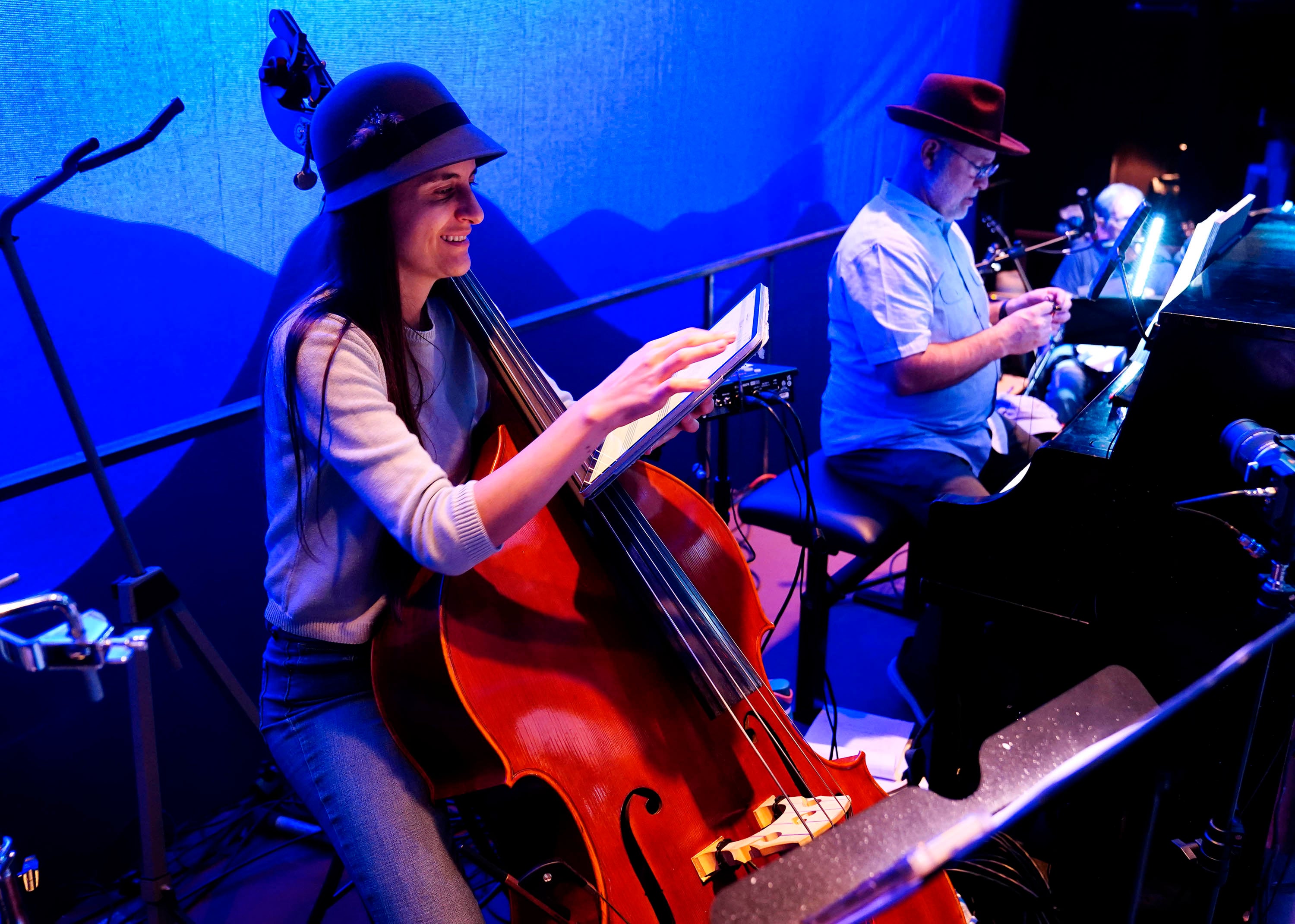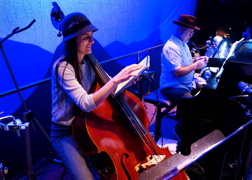 Bassist Tracy Haddad and members of the band check their music before the start of rehearsal on March 3, 2026, for the theatre department’s production of “Bright Star” at Ethington Theatre. -