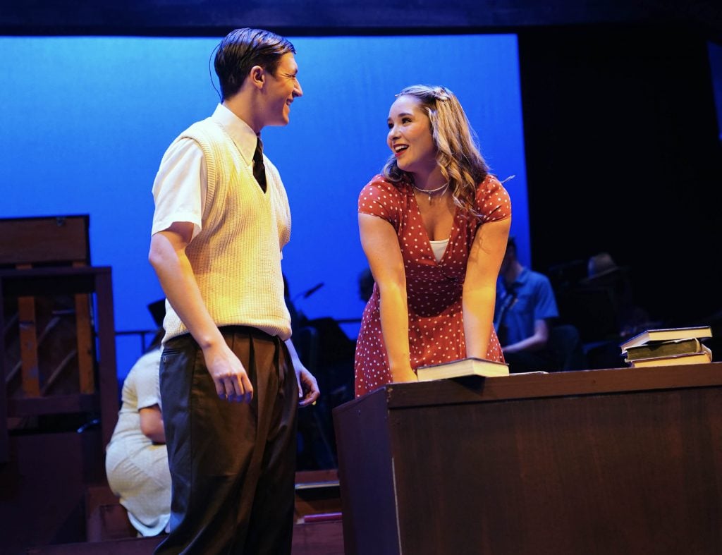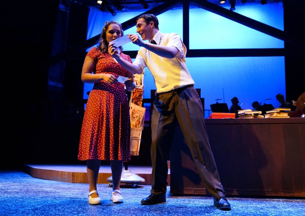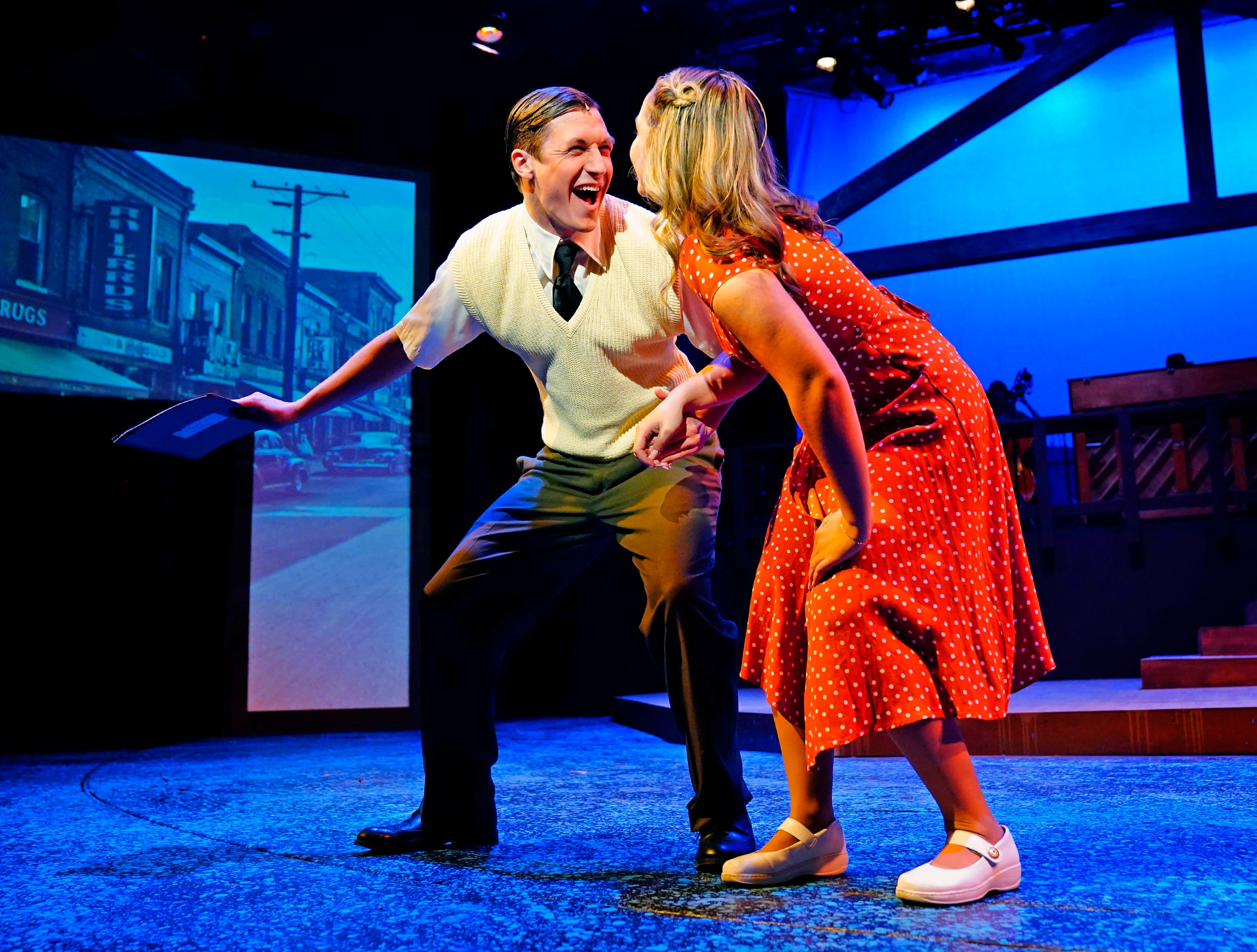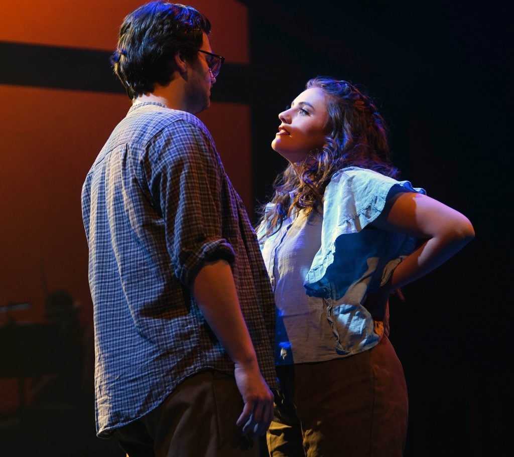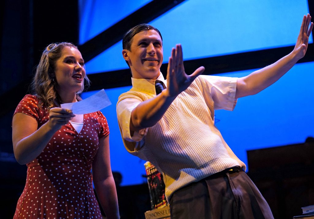 Carter Giannetti plays Billy Cane and Maiya Morhweis is Margo Crawford in “Bright Star” at Ethington Theatre. -