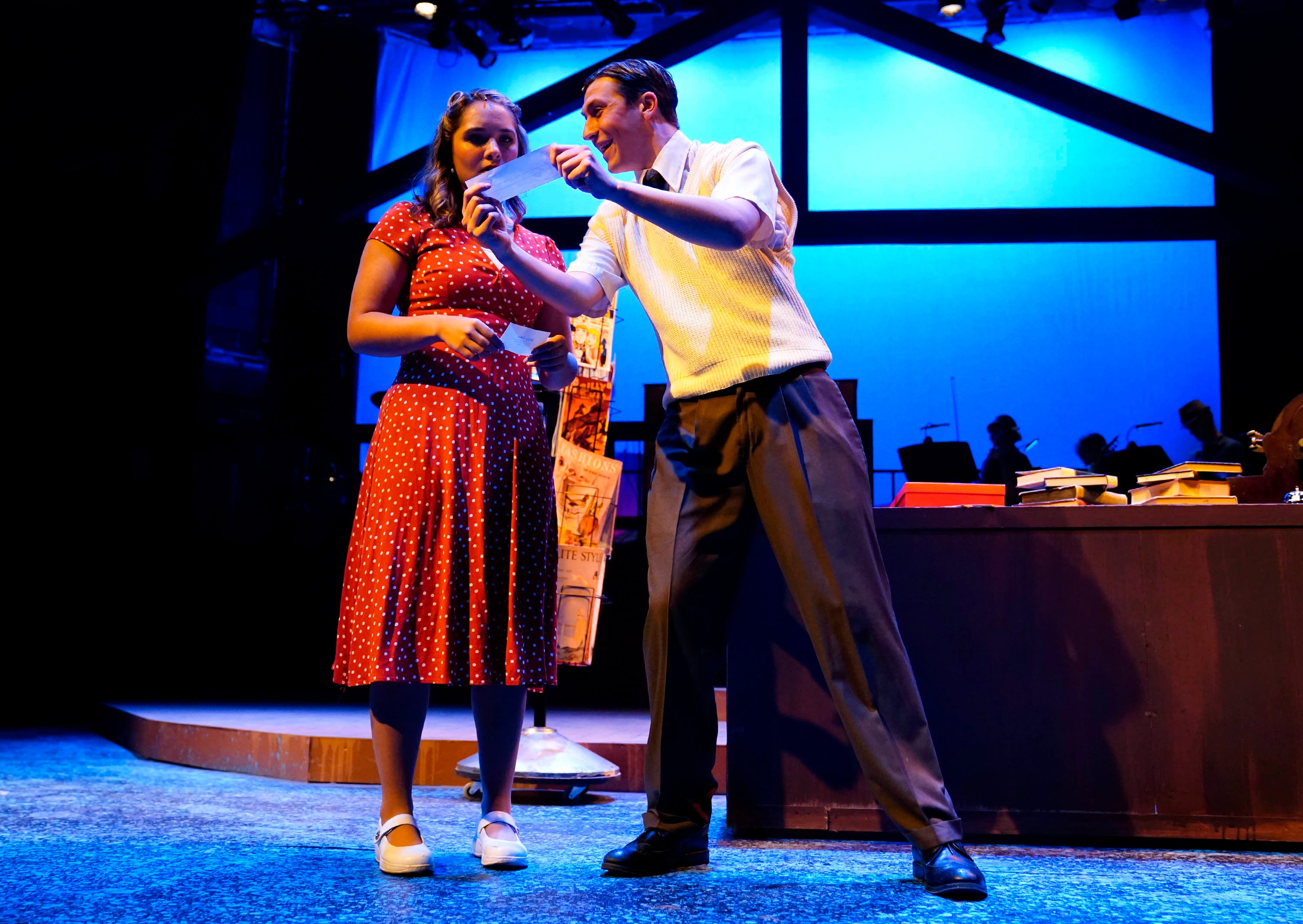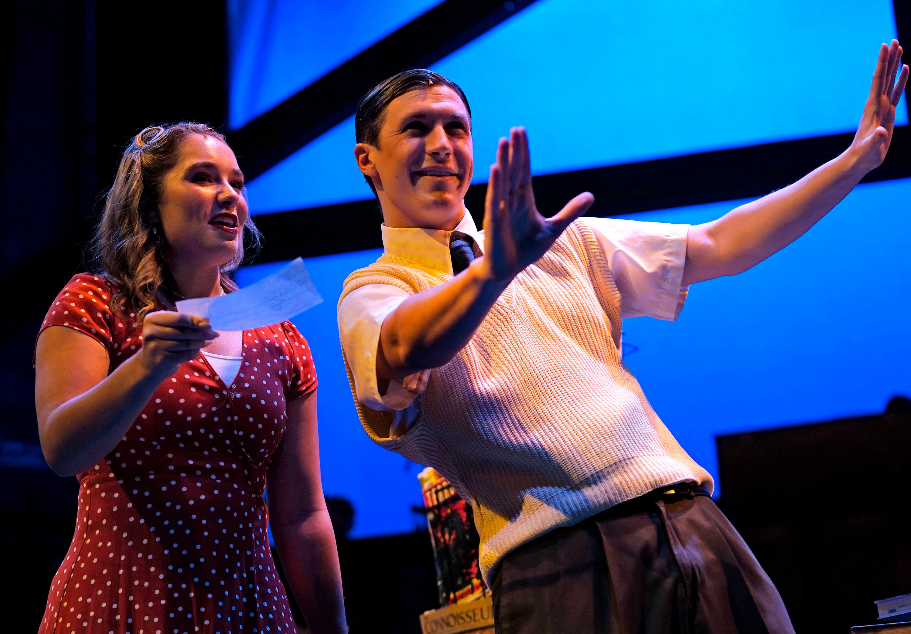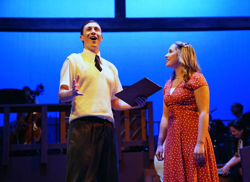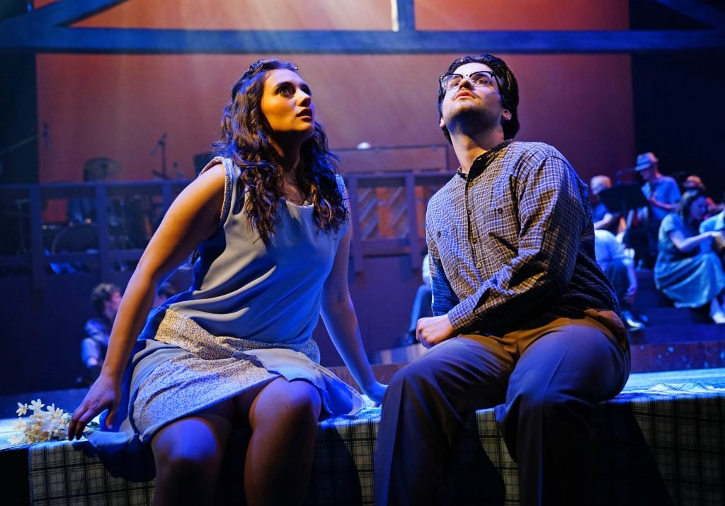 Carter Giannetti plays Billy Cane and Maiya Morhweis is Margo Crawford in “Bright Star” at Ethington Theatre. -