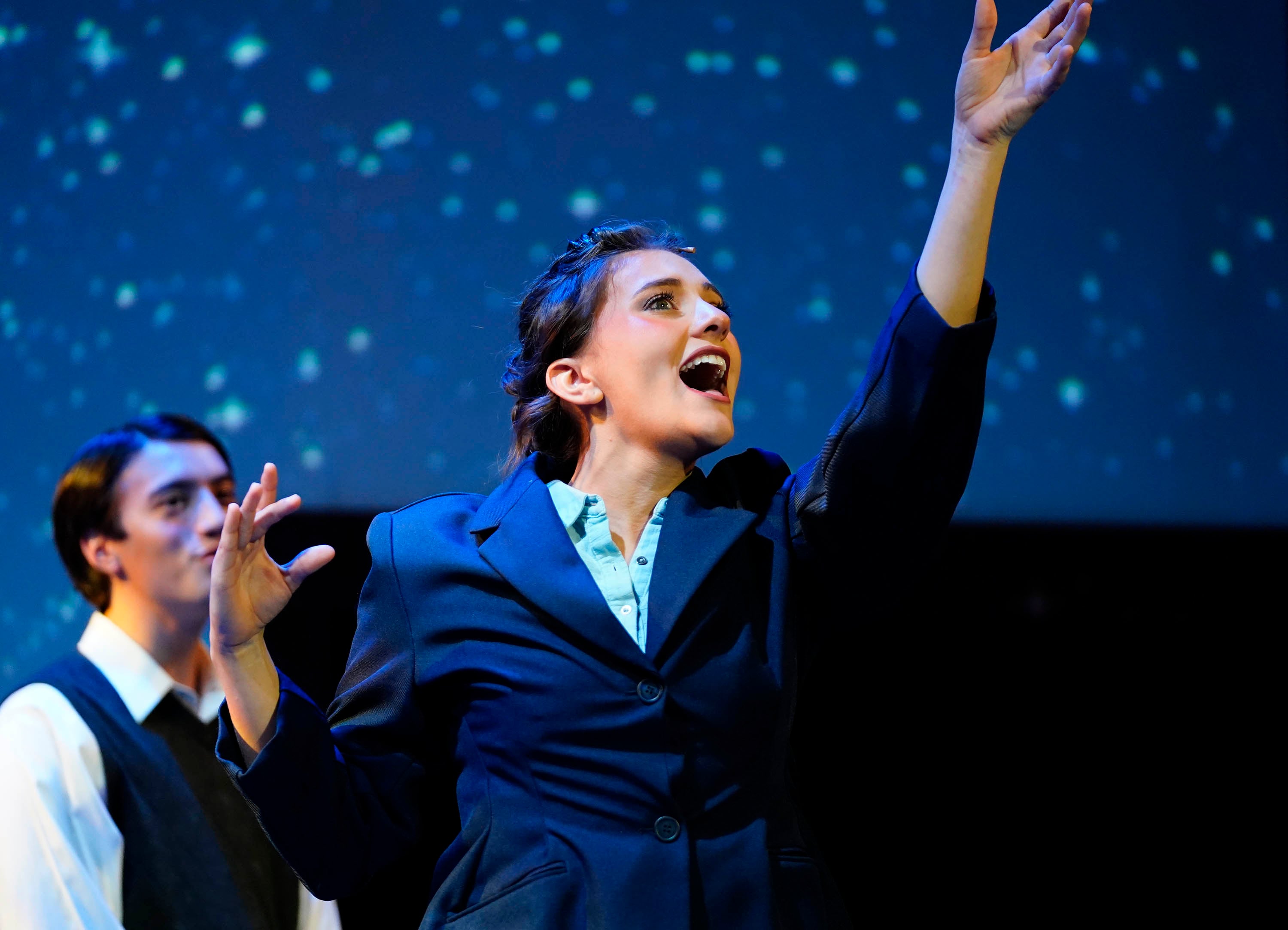 Carter Giannetti, as Billy Cane, and Maiya Morhweis, as Margo Crawford, rehearse a scene for “Bright Star” at Ethington Theatre on March 3, 2026. -