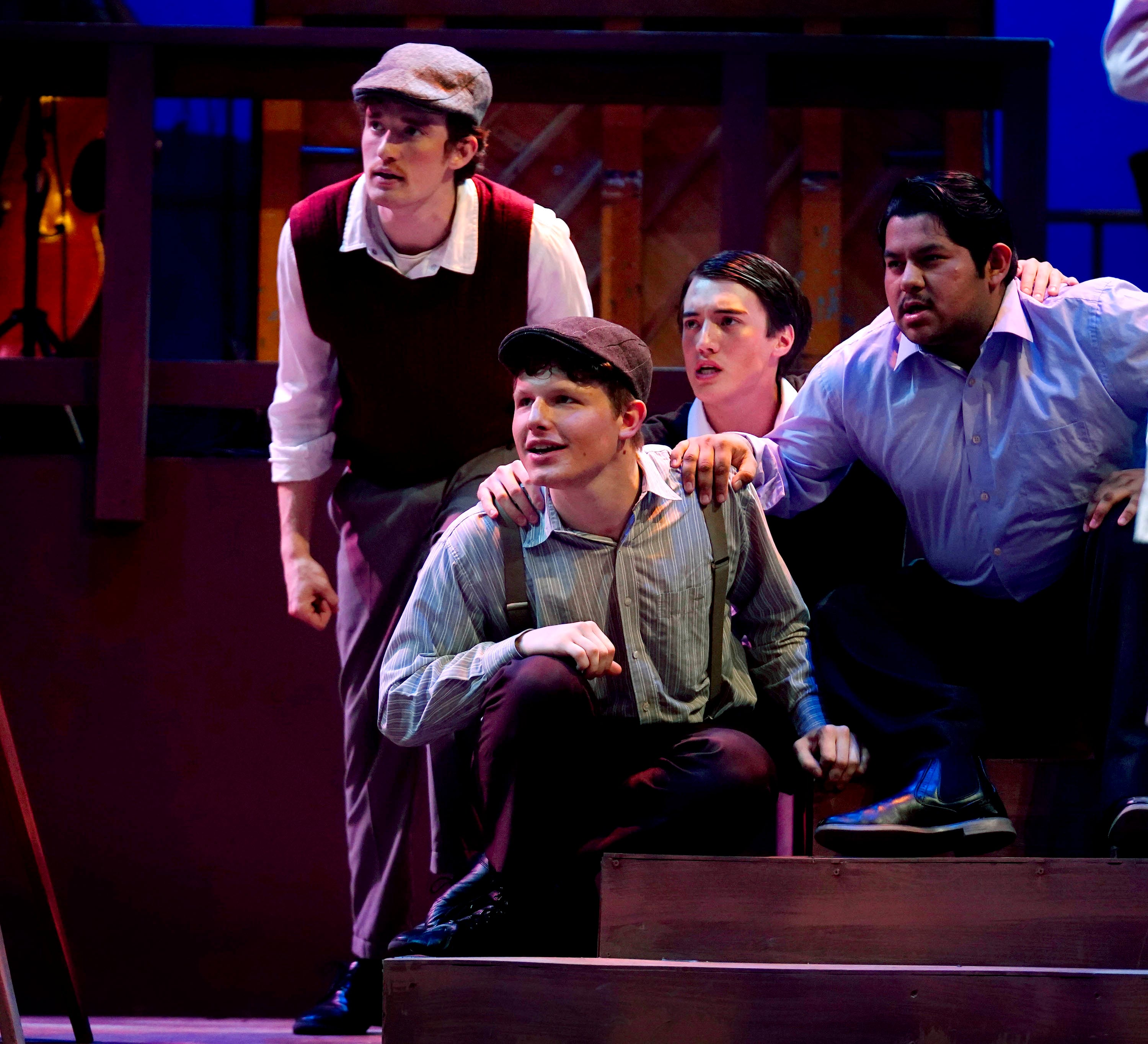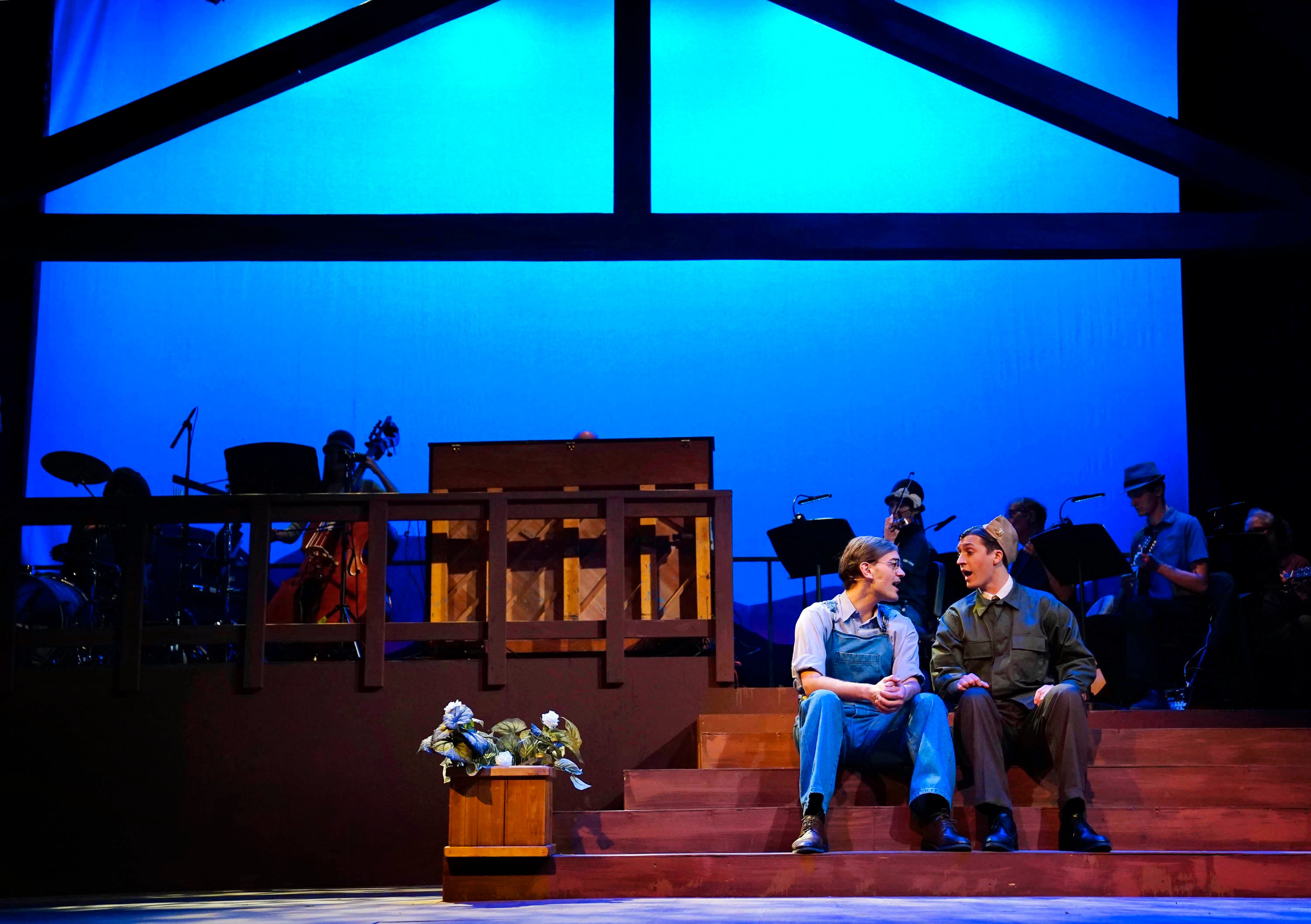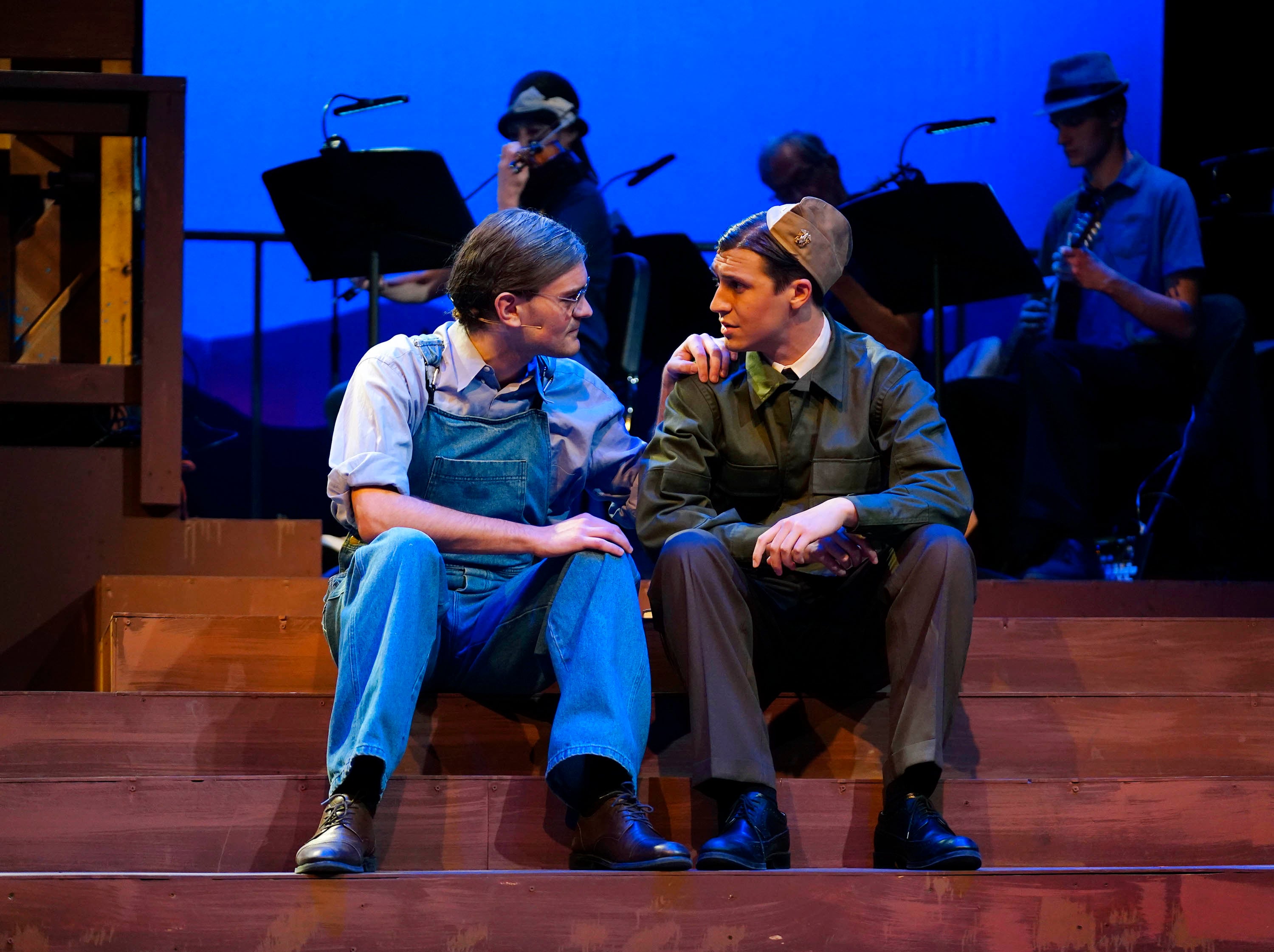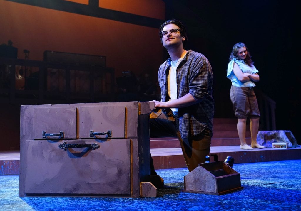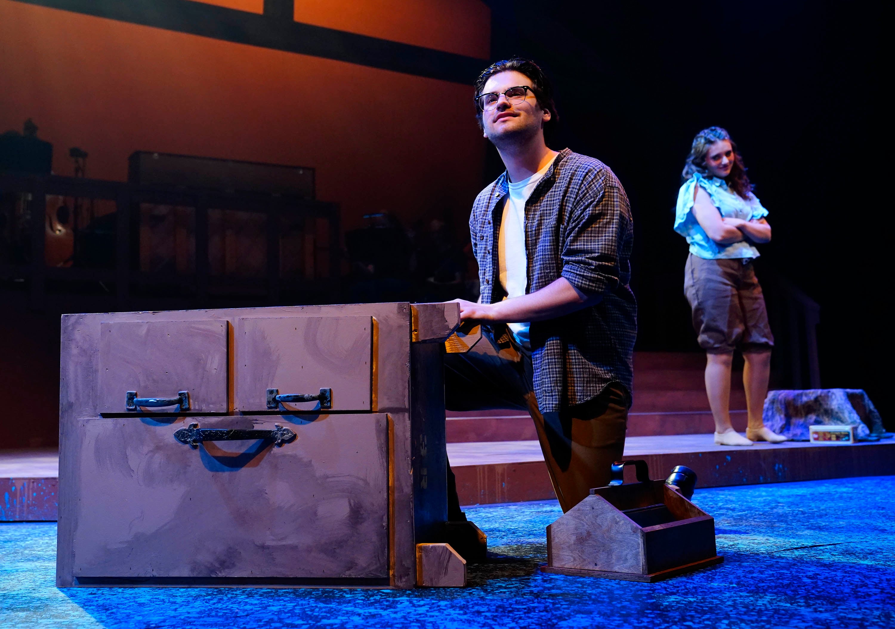 Payton Sharpe and Carter Giannetti (from left) on set during a rehearsal for “Bright Star” at Ethington Theatre on March 3, 2026. -