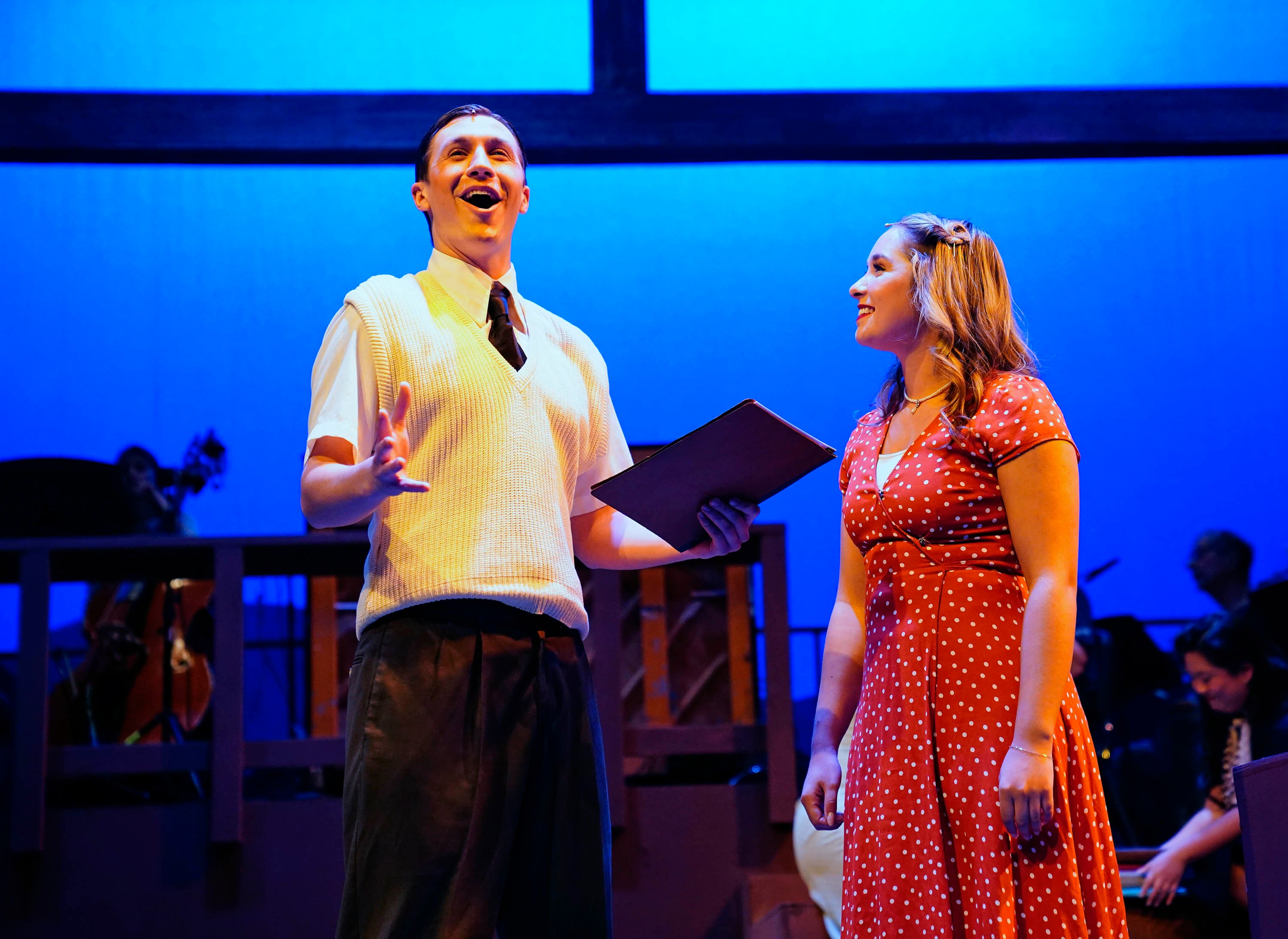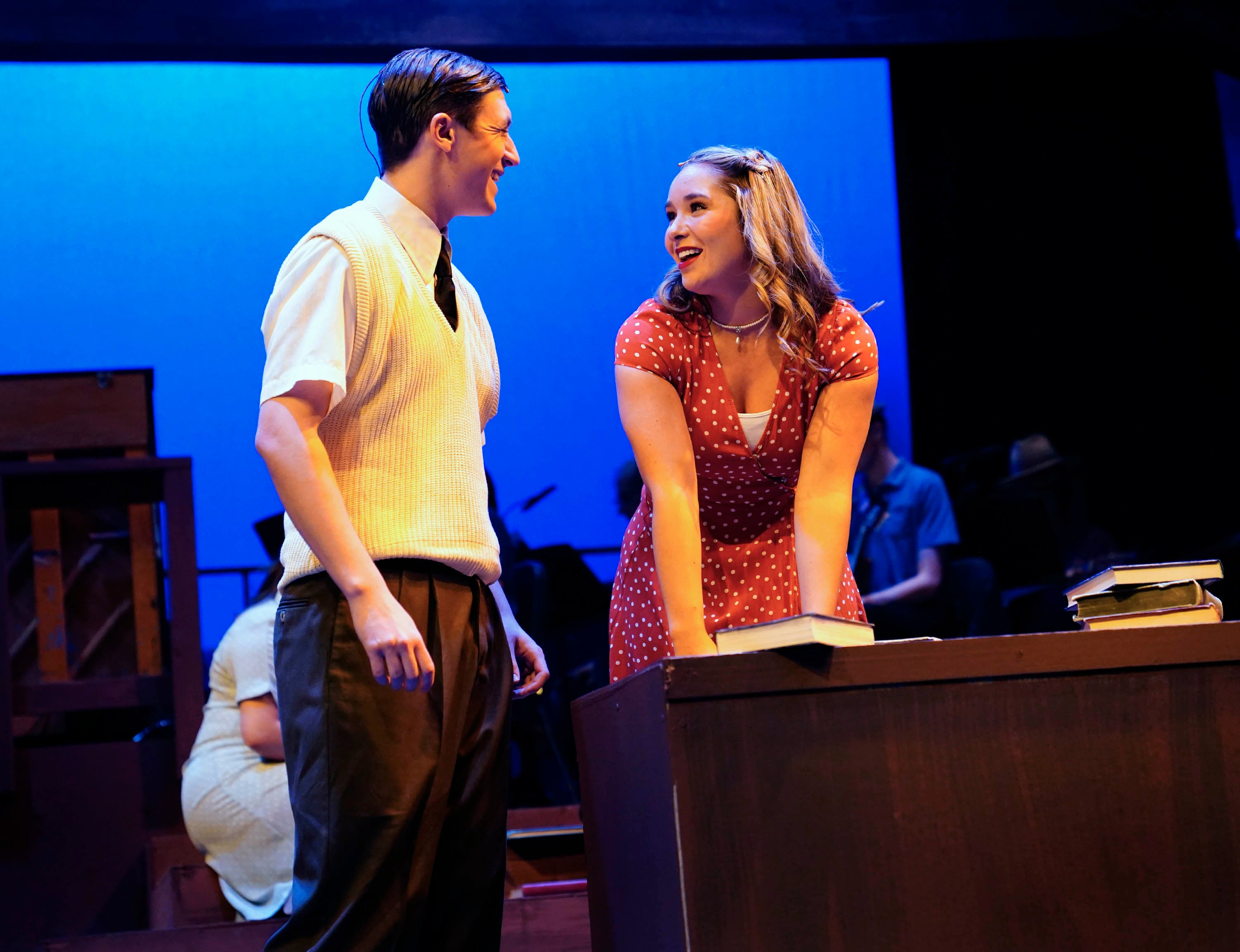 Luke Lundberg, as Jimmy Ray Dobbs, and Kailey Mazur, as Alice Murphy, reheare a scene in the theatre department’s production of “Bright Star” at Ethington Theatre on March 3, 2026. -