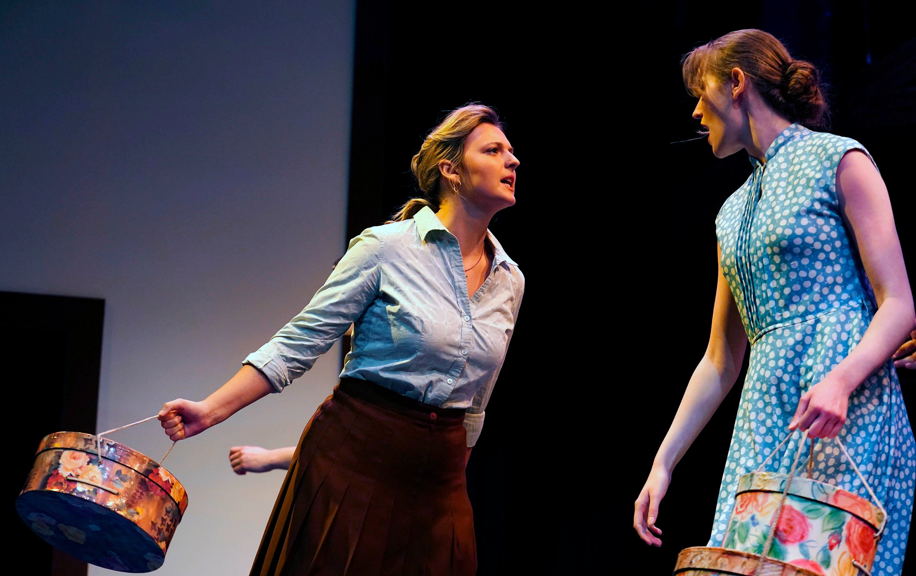Kailey Mazur, as Alice Murphy, and Savannah Swiatkowski, as Mama Murphy, during a rehearsal for the theatre department’s production of “Bright Star” at Ethington Theatre on March 3, 2026. -
