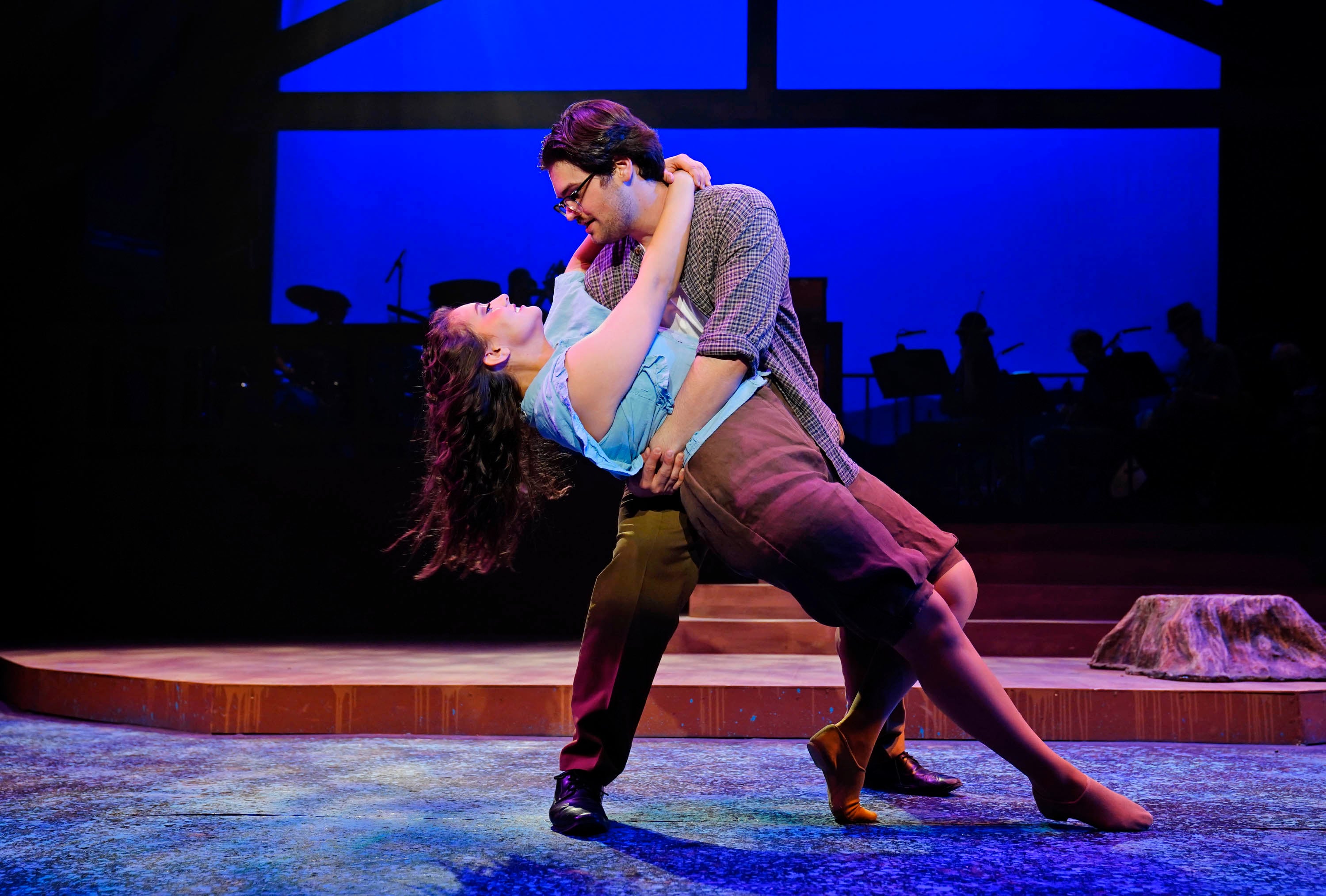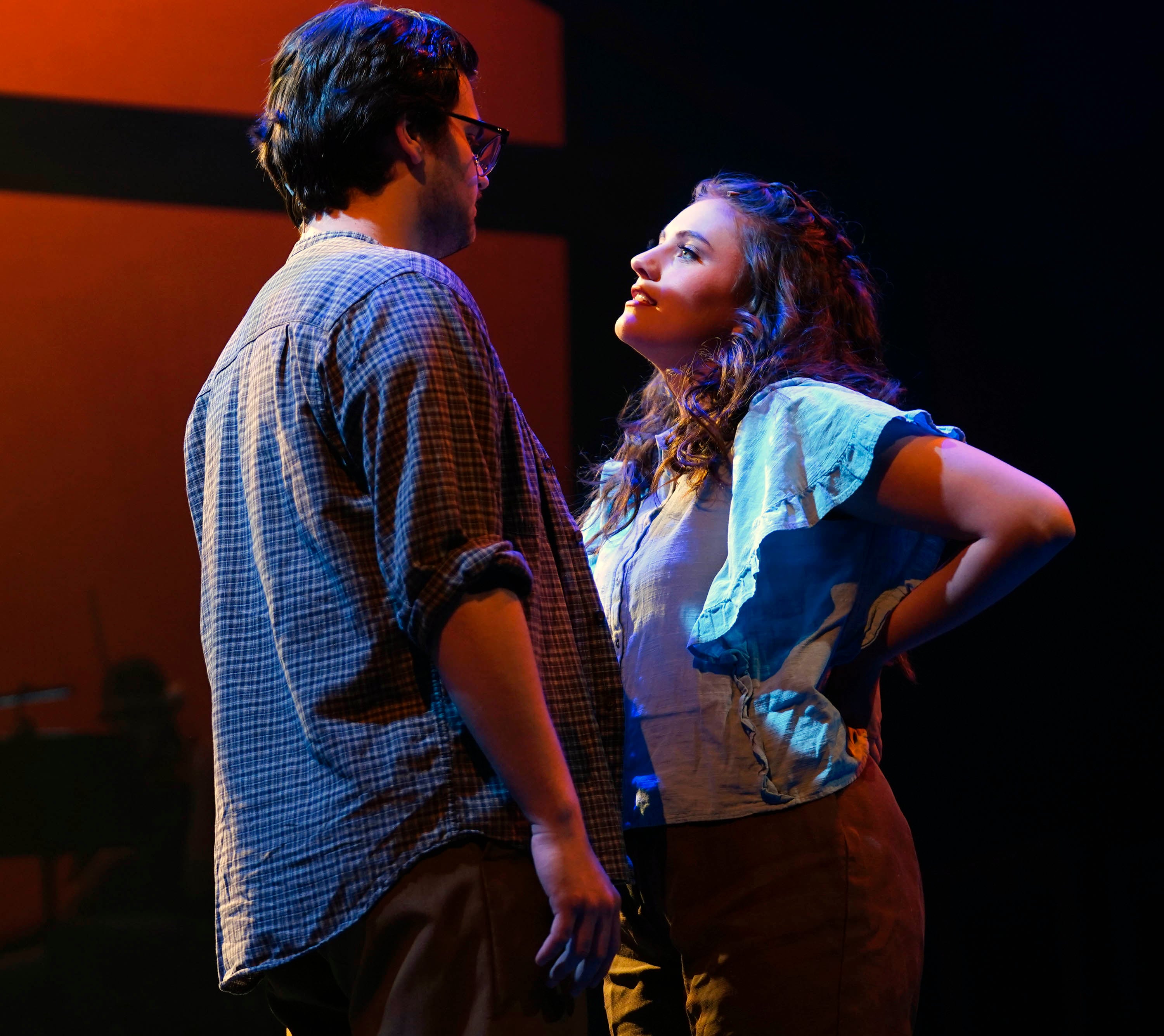 Luke Lundberg, as Jimmy Ray Dobbs, and Kailey Mazur, as Alice Murphy, during a rehearsal for the theatre department’s production of “Bright Star” at Ethington Theatre on March 3, 2026. -