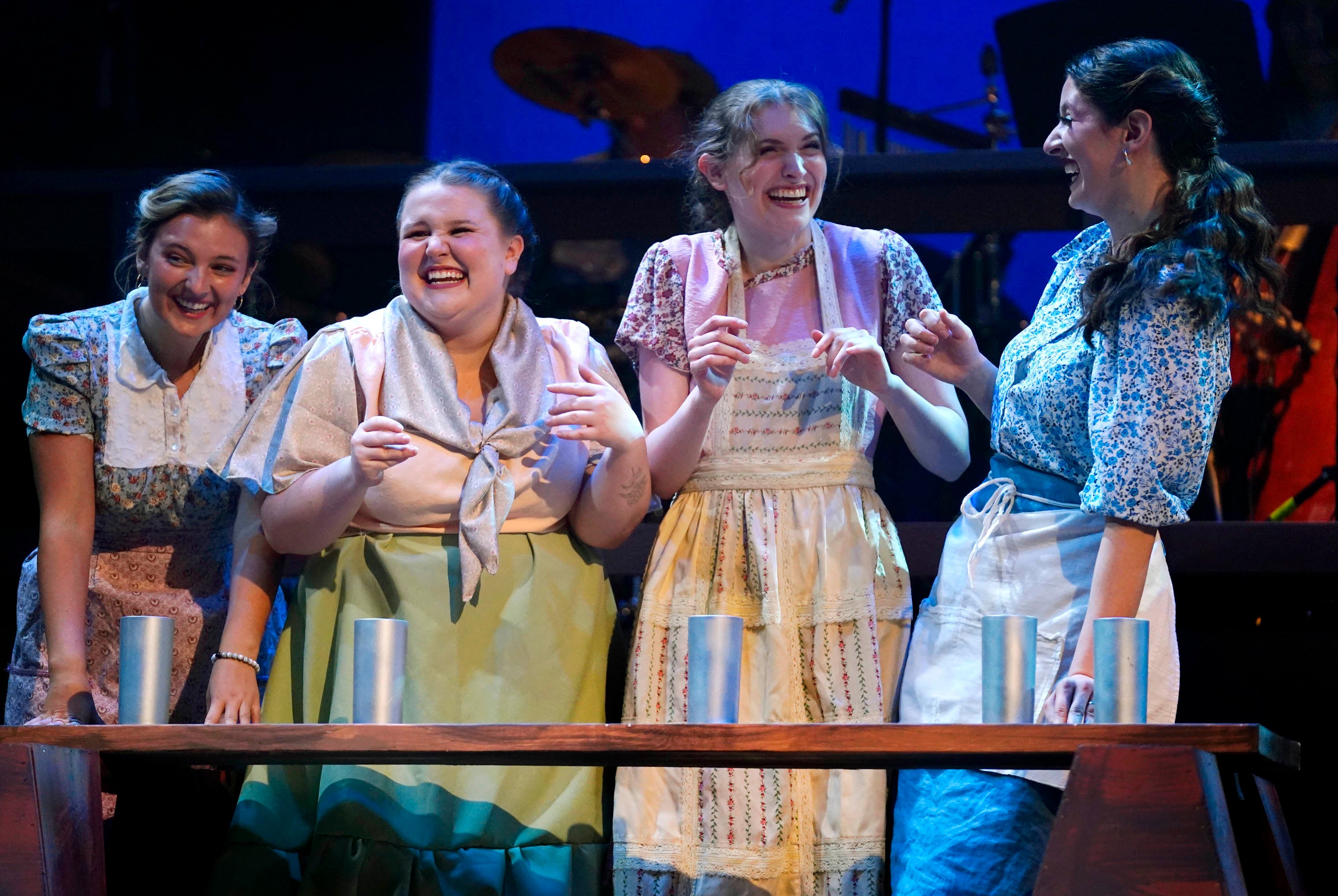 Kailey Mazur (center), who plays Alice Murphy, leads the cast in a musical number during rehearsal of the theatre department’s production of “Bright Star” at Ethington Theatre on March 3, 2026. -