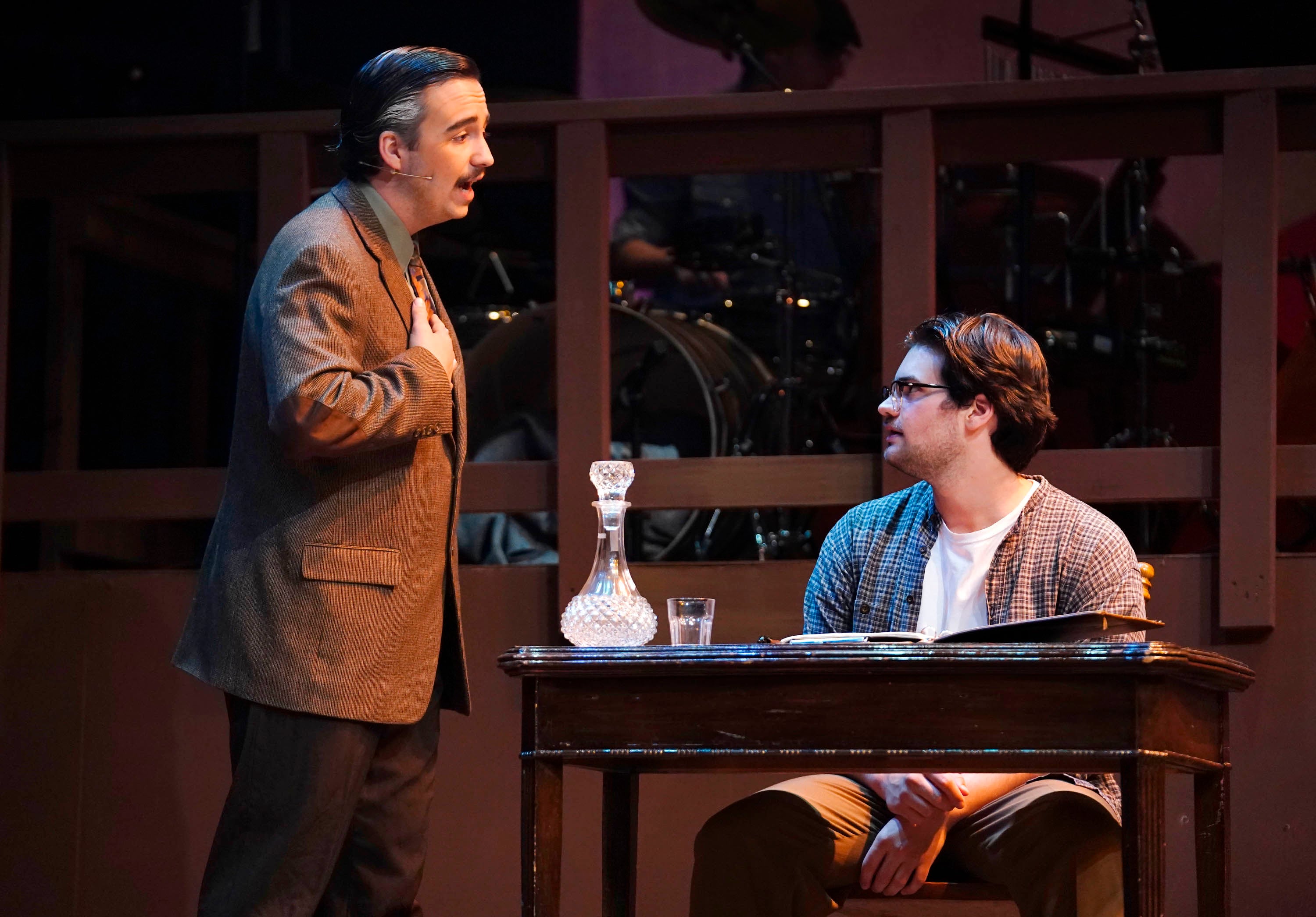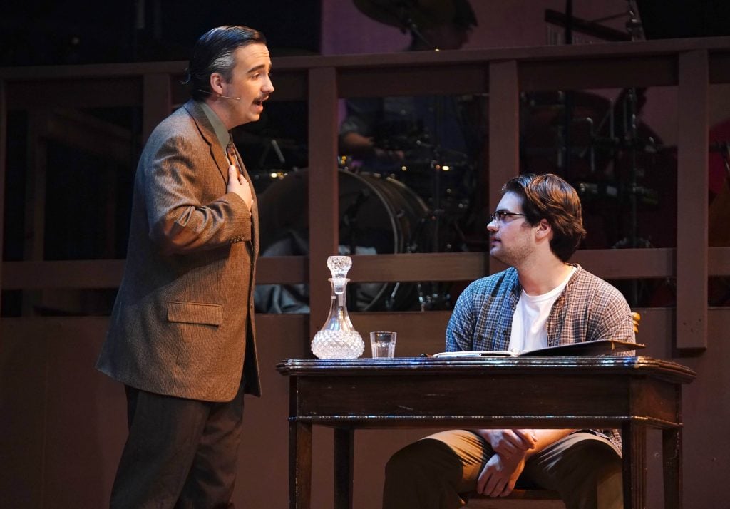 Caleb Moran plays Mayor Josiah Dobbs, and Luke Lundberg is Jimmy Ray Dobbs in the theatre department’s production of “Bright Star” at Ethington Theatre. -