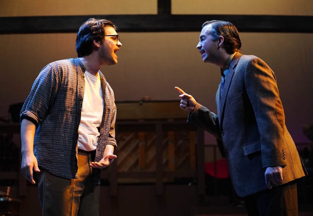 Jimmy Ray Dobbs (Luke Lundberg, left) and Mayor Josiah Dobbs (Caleb Moran) have a heated exchange in the theatre department’s production of “Bright Star” at Ethington Theatre. -