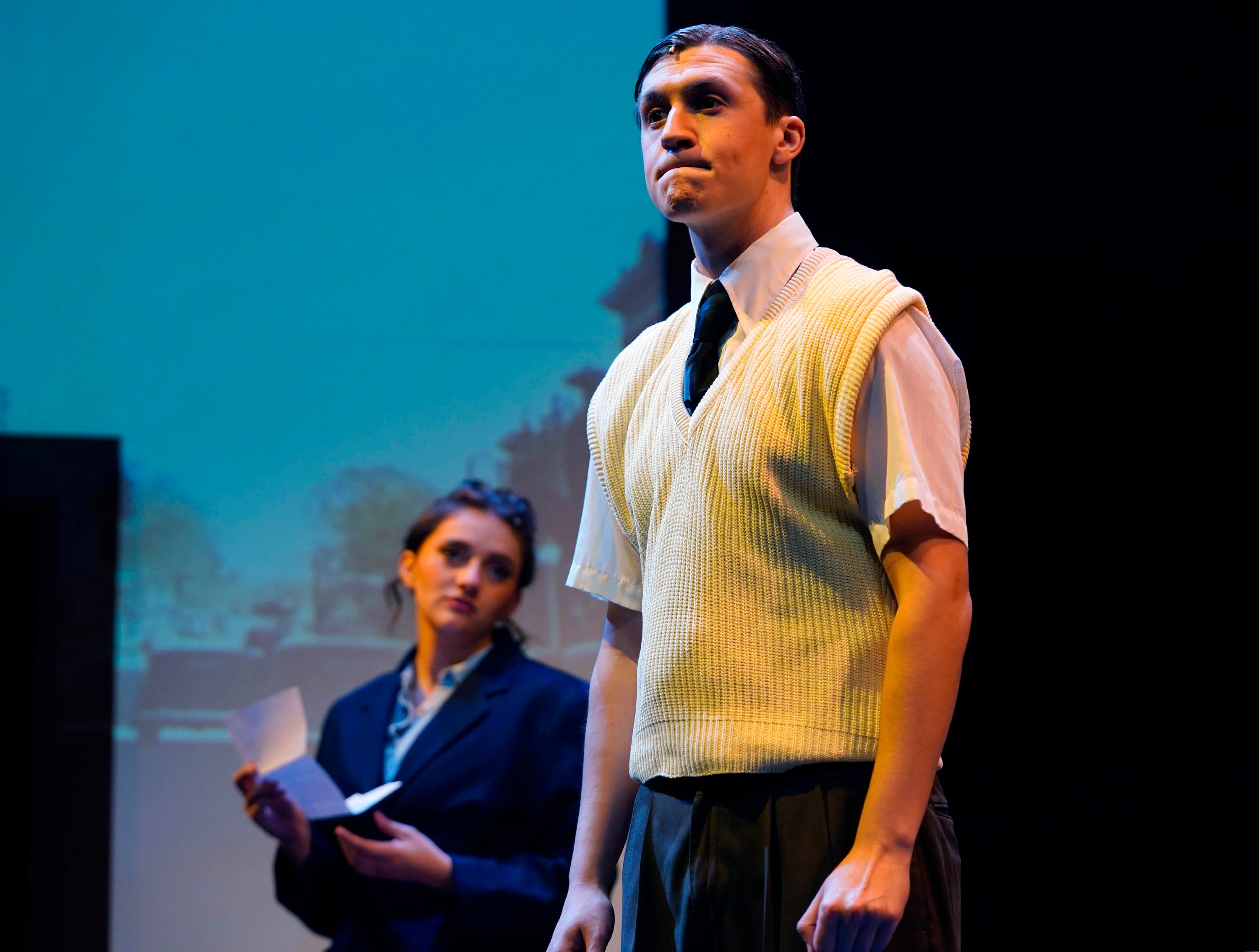 Luke Lundberg, as Jimmy Ray Dobbs, and Kailey Mazur, as Alice Murphy, rehearse a scene in the theatre department’s production of “Bright Star” at Ethington Theatre on March 3, 2026. -