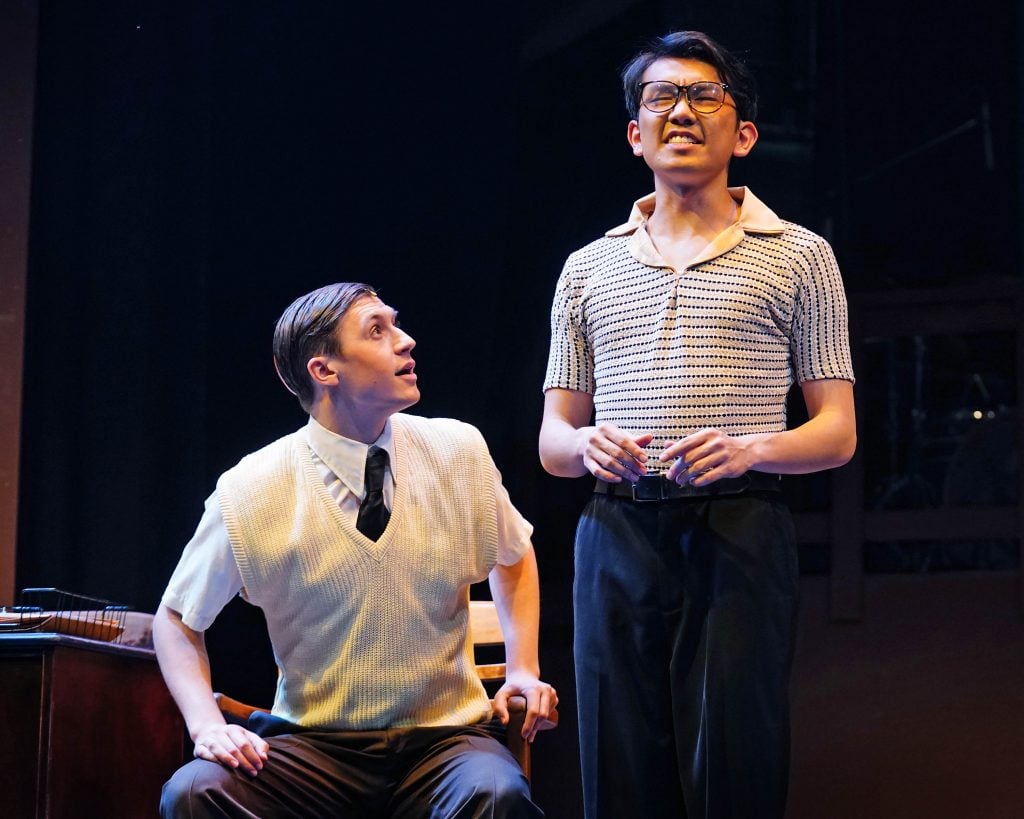 Carter Giannetti, as Billy Cane, and Easton Ikenaga, as Daryl Ames, during a rehearsal for the theatre department’s production of “Bright Star” at Ethington Theatre on March 3, 2026. -