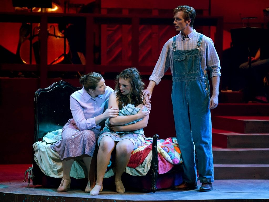 Kailey Mazur plays Alice Murphy, Savannah Swiatkowski is Mama Murphy and Brandon Erickson-Moen portrays Daddy Murphy, in "Bright Star" at Ethington Theatre.