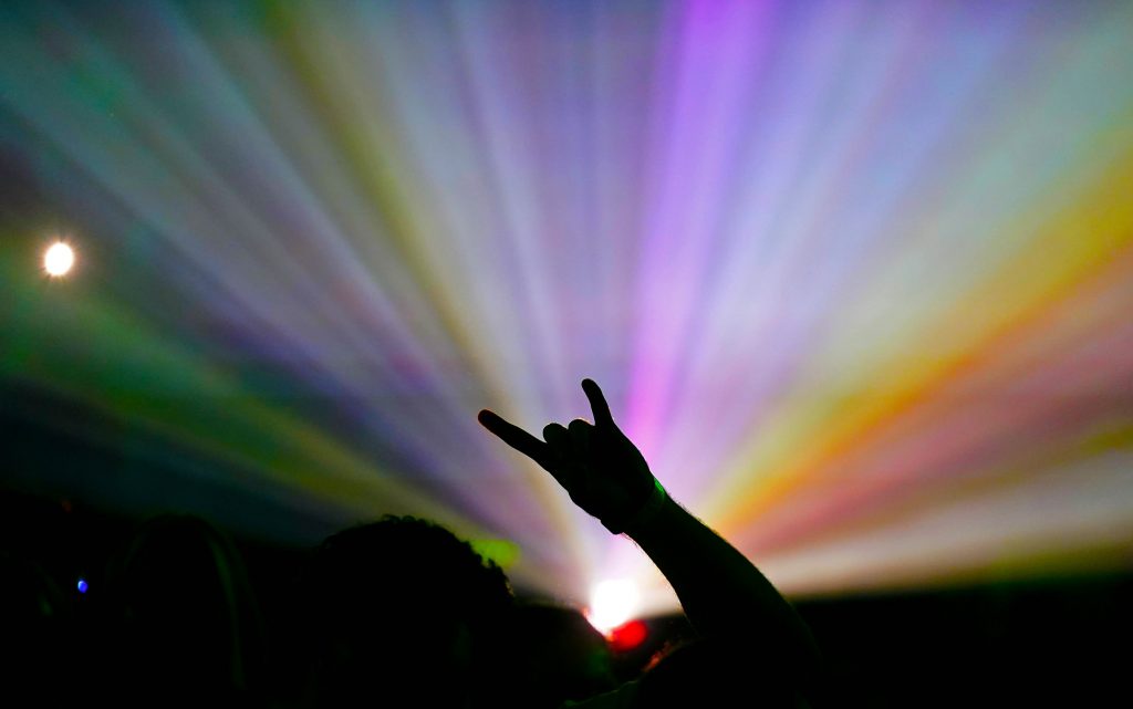 A student flashes a Lopes-Up through a "Somewhere Over the Rainbow"-like projection during the start of the Canyon Activities Board’s "Wicked"-themed Lip Sync at Global Credit Union Arena on Nov. 13, 2025. -