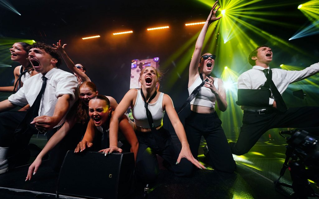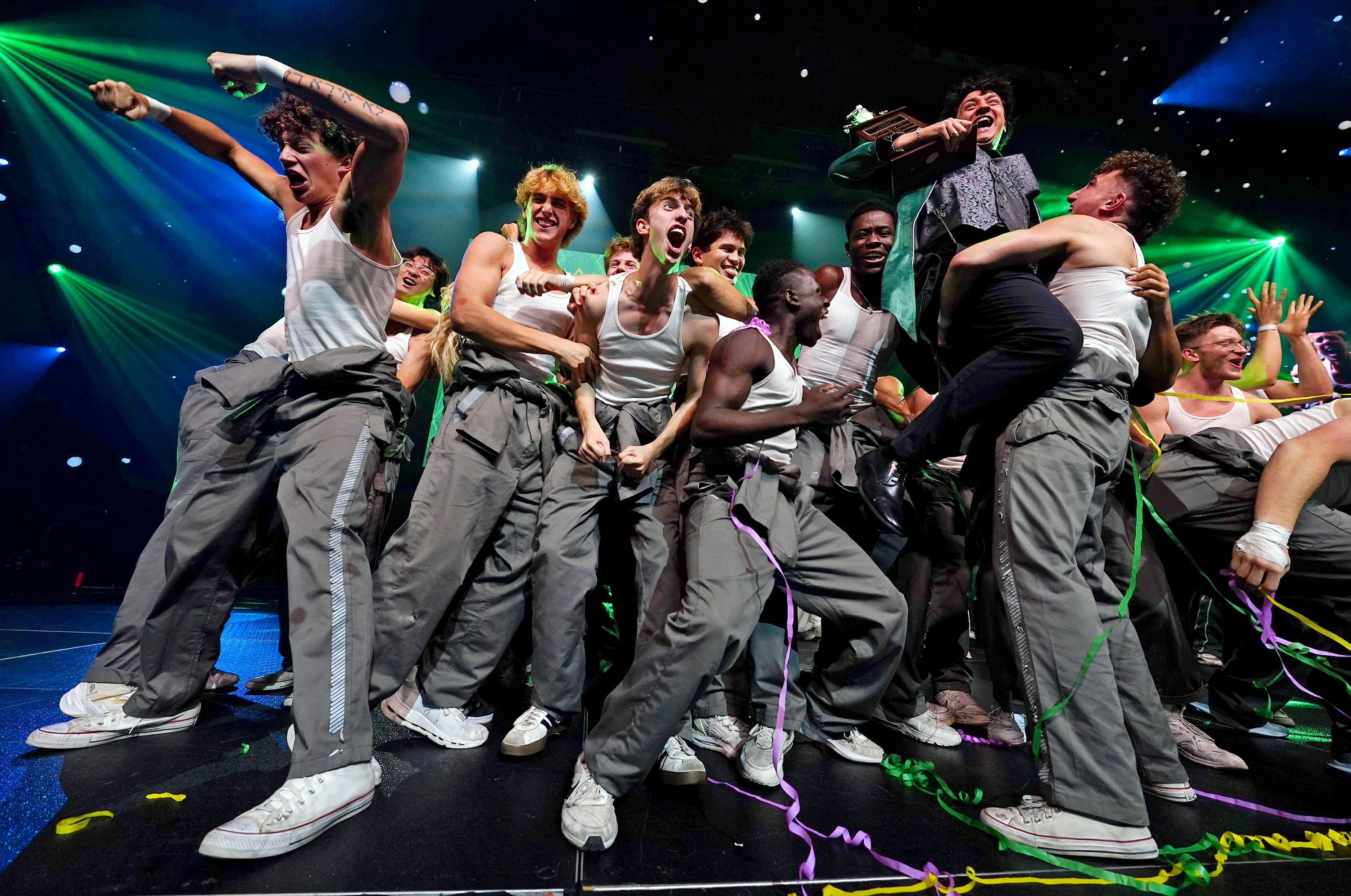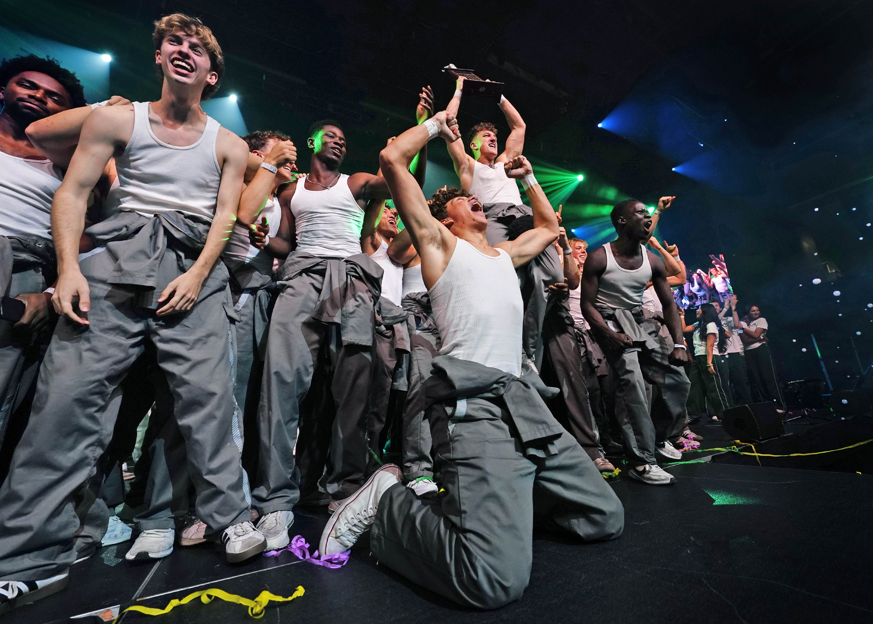 Members of Deliverance celebrate as they are announced as the winners of the Canyon Activities Board’s "Wicked"-themed Lip Sync at Global Credit Union Arena on Nov. 13, 2025. -
