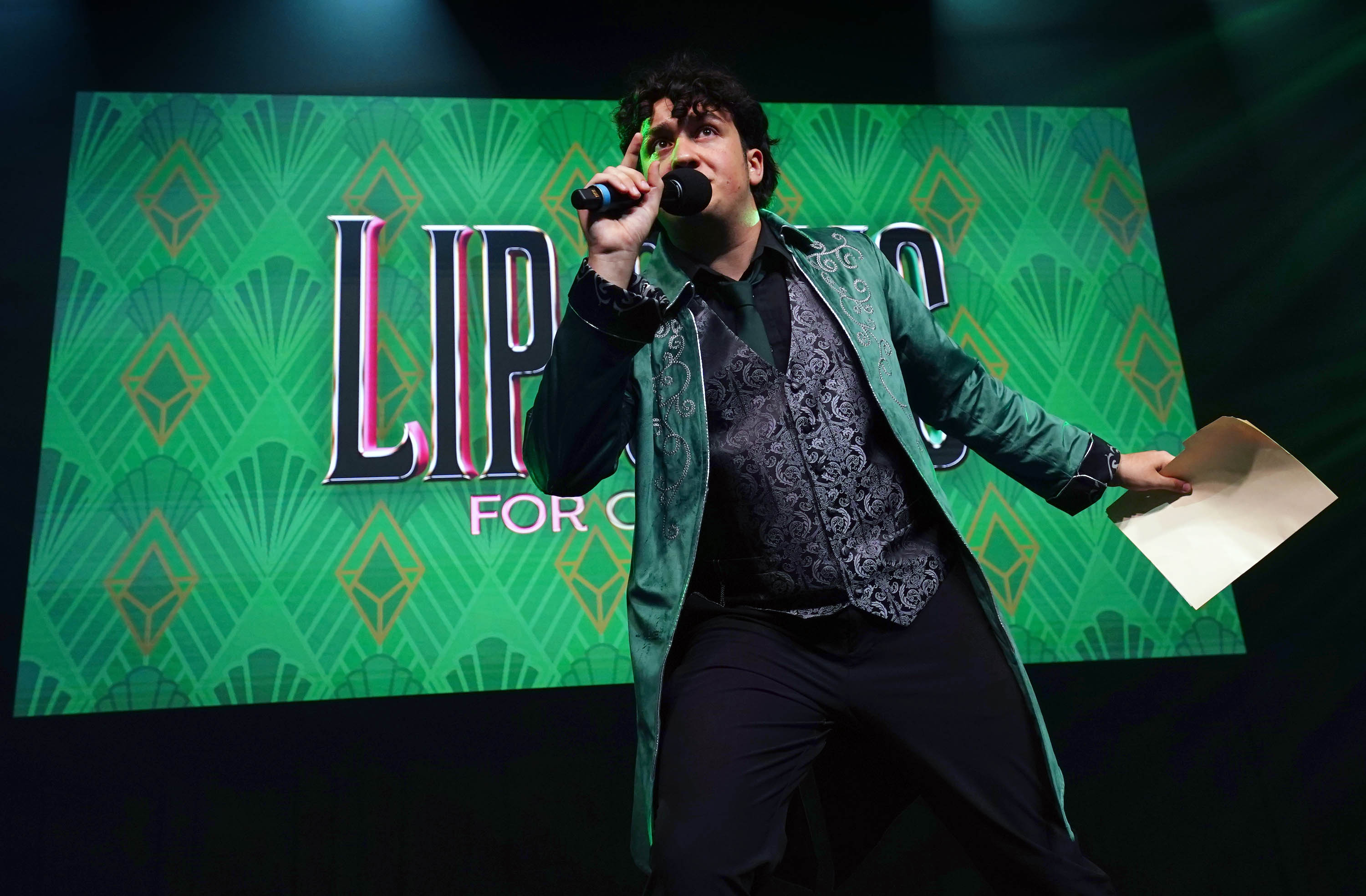 Event host Matthew Stout holds the winner's names in a folder during the Canyon Activities Board’s "Wicked"-themed Lip Sync at Global Credit Union Arena on Nov. 13, 2025. -