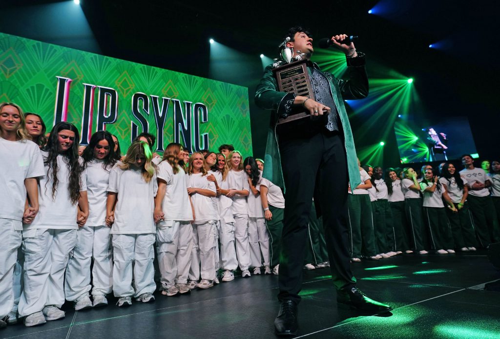 Event host Matthew Stout holds the Lip Sync trophy as he announces the winner during the Canyon Activities Board’s "Wicked"-themed Lip Sync at Global Credit Union Arena on Nov. 13, 2025. -