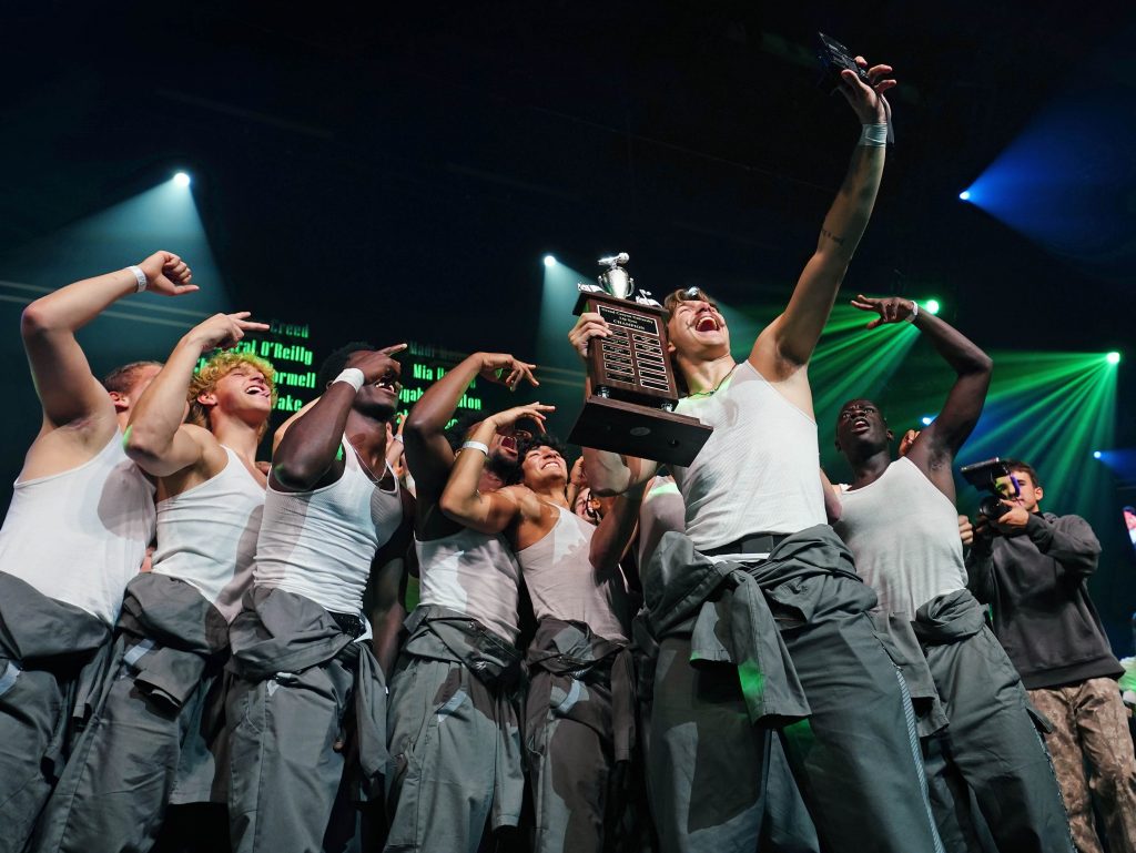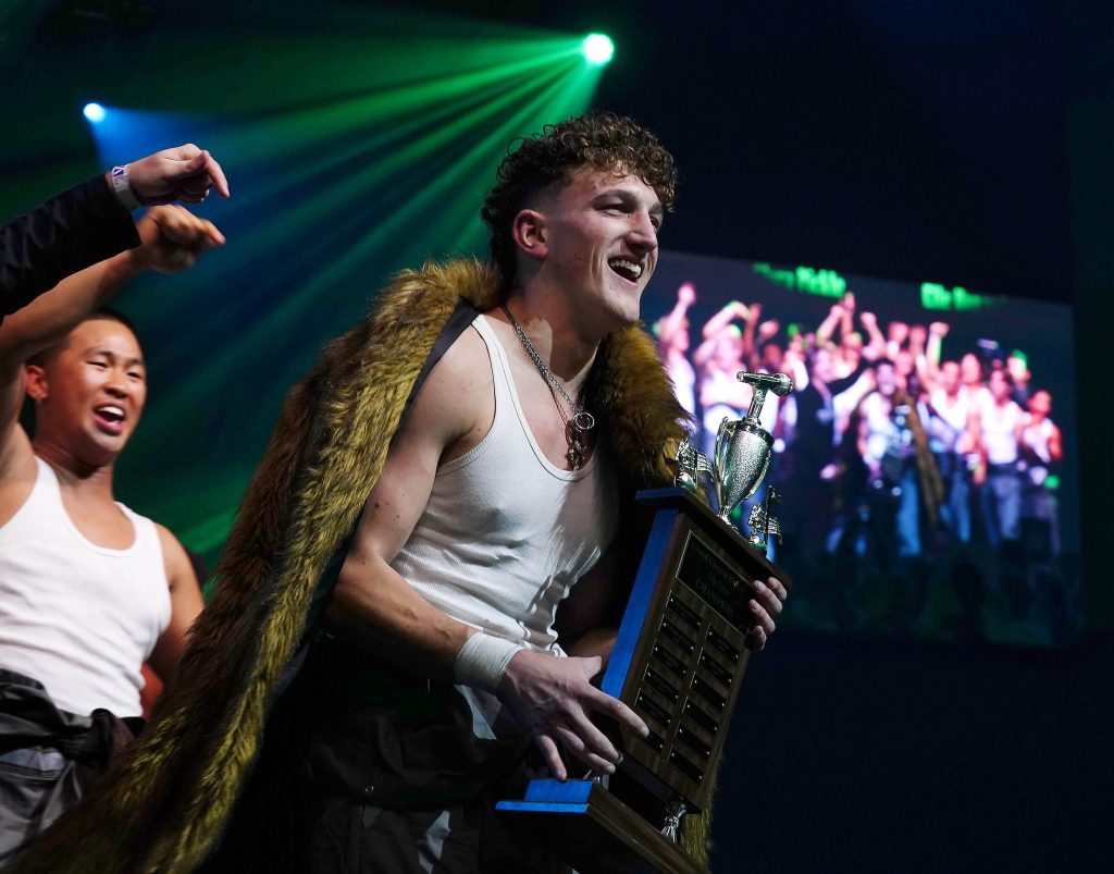 Team captain Porter Sonntag holds the trophy after Deliverance wins the Canyon Activities Board’s "Wicked"-themed Lip Sync at Global Credit Union Arena on Nov. 13, 2025. -