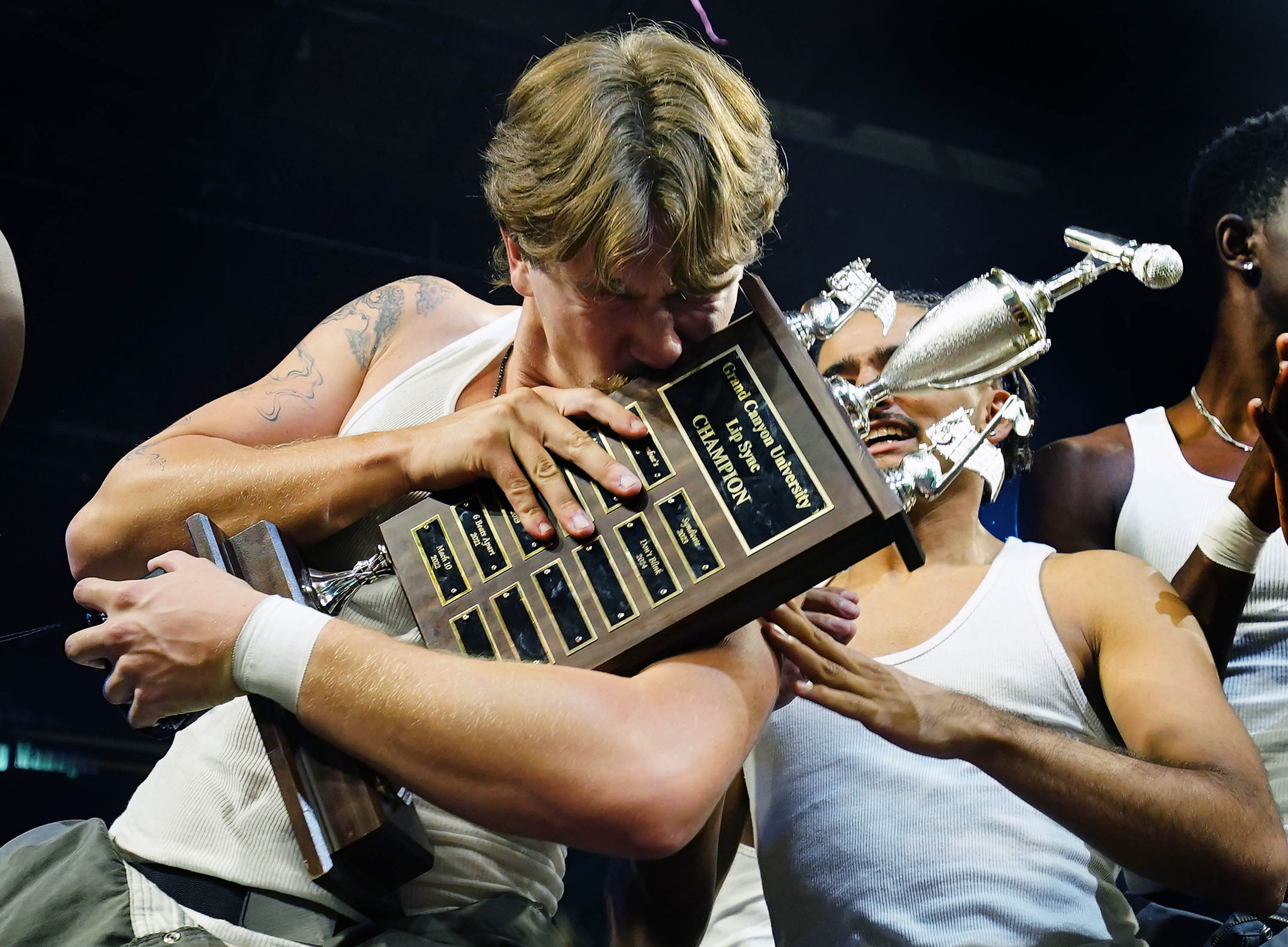 Senior team member Liam Cornish hugs and kisses the trophy after Deliverance wins the Canyon Activities Board’s "Wicked"-themed Lip Sync at Global Credit Union Arena on Nov. 13, 2025. -