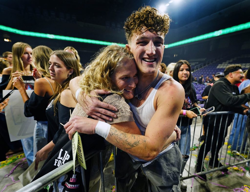 Team captain Porter Sonntag is congratulated by his mother, Rosina Sonntag, after Deliverance wins the Canyon Activities Board’s "Wicked"-themed Lip Sync at Global Credit Union Arena on Nov. 13, 2025. -