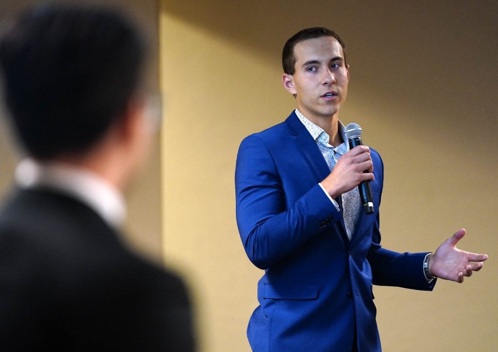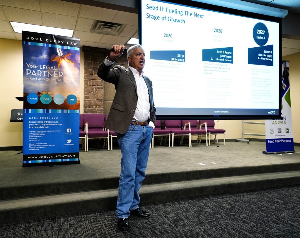 Tyler Prochnow, CEO of Wootz, talks about the growth of his company during the Canyon Angels pitch event at Joshua North. April 8, 2026. -
