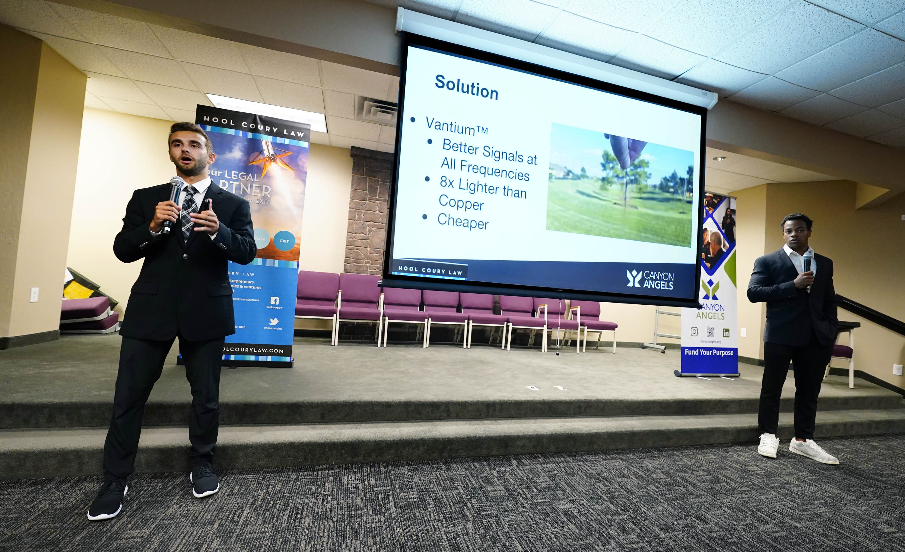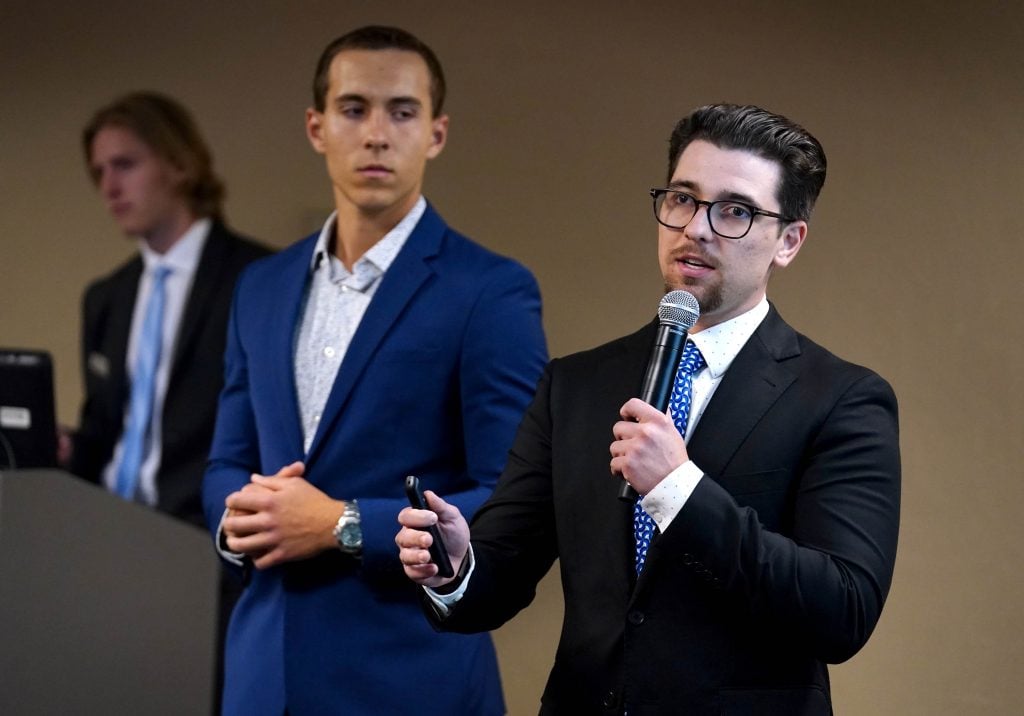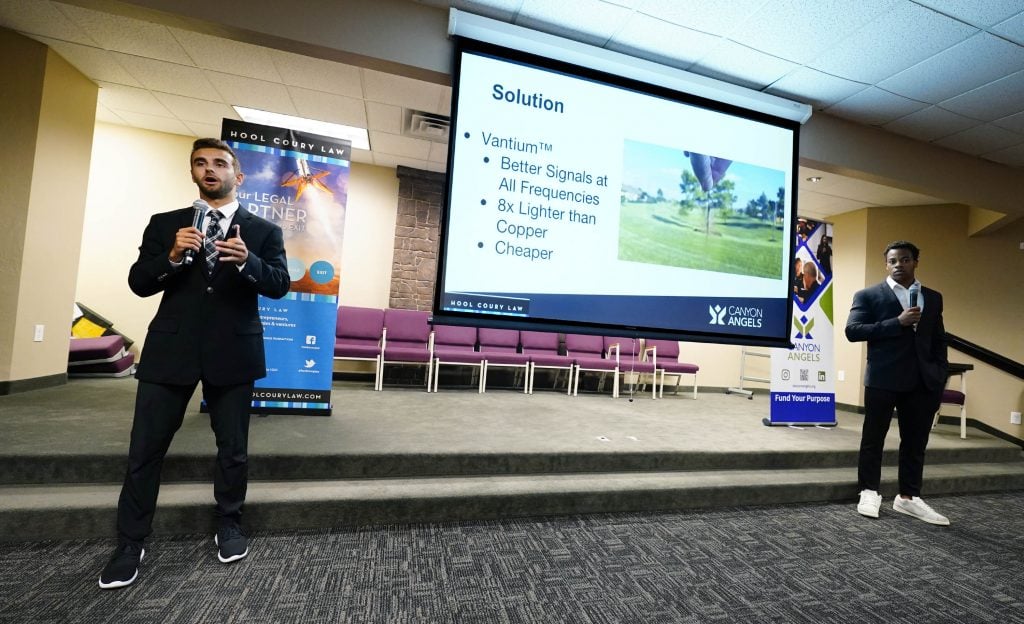 Students Chase Hanson and Anika Birkelo give their due diligence assessment for the company Solstar during the Canyon Angels pitch event. April 8, 2026. -