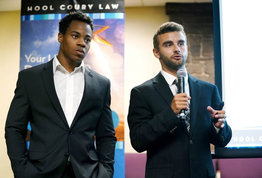 Students Trenton Wagner (right) and Isiah Zanone give their due diligence report for the company Wootz during the Canyon Angels pitch event at Joshua North. April 8, 2026. -