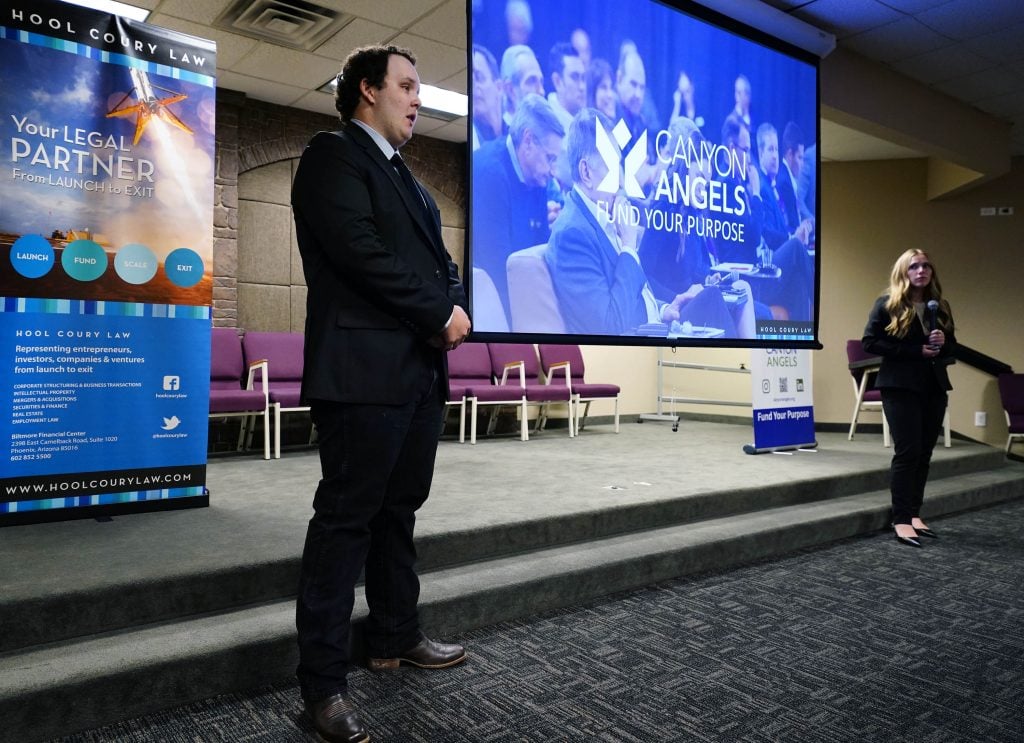 Tyler Prochnow presents his company, Wootz, during the Canyon Angels pitch event at Joshua North. April 8, 2026. -