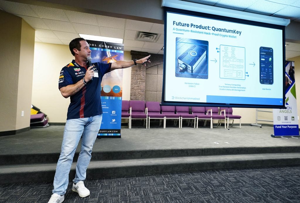 David Richards, CEO of Blockchain Unmasked, talks about his company during the Canyon Angels pitch event. April 8, 2026. -