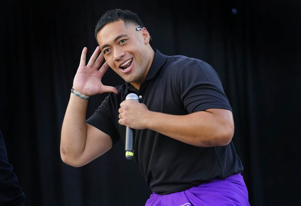 Event MC Jabez Aloalii listens for the crowd as they take part in a “chee hoo” shout contest during the Multicultural Office-sponsored Pasifika Fest at the Quad on April 9, 2025. -