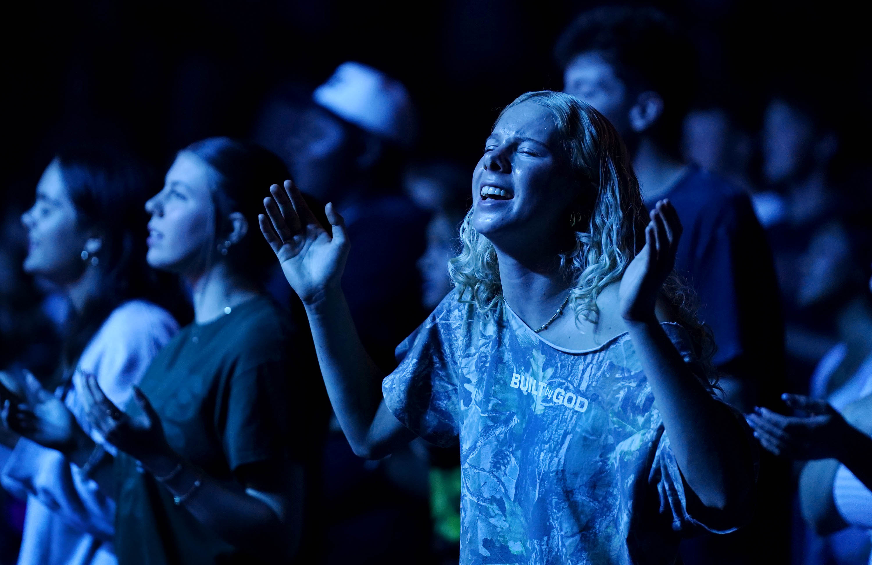 Students joyfully give praise during Chapel at Global Credit Union Arena. March 30, 2026 -