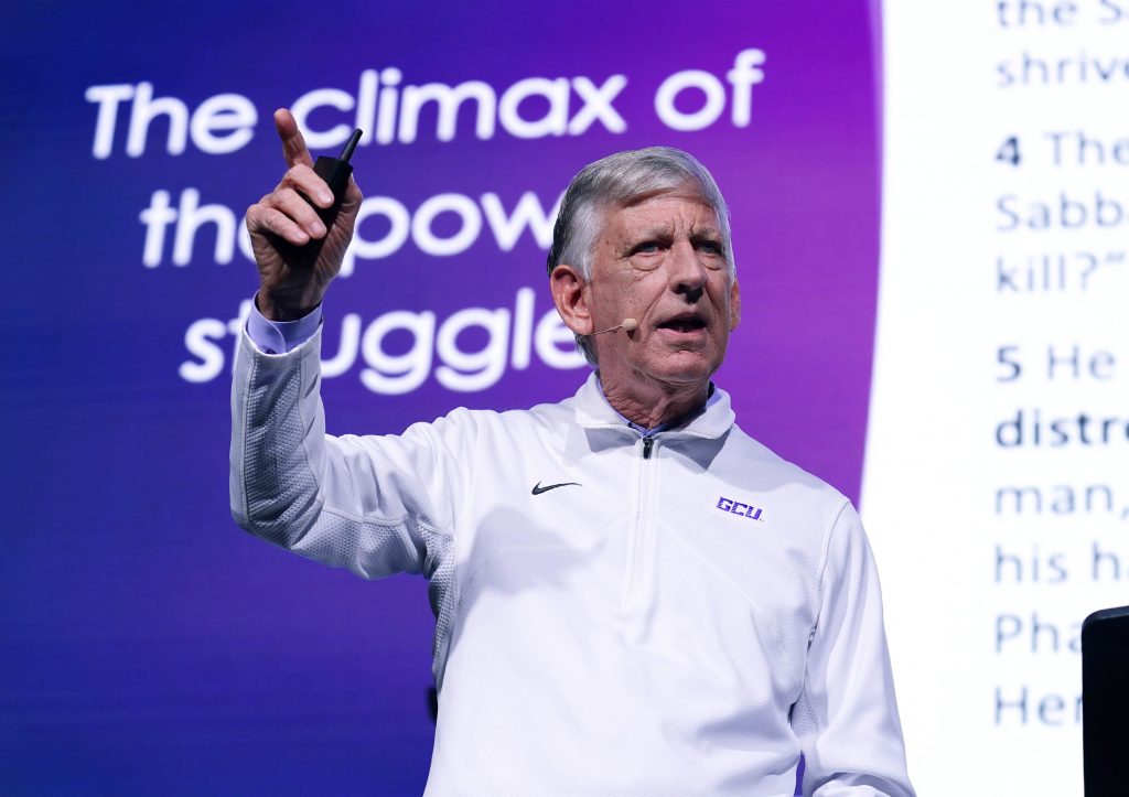 GCU President Brian Mueller discusses God's struggle with Satan during Chapel at Global Credit Union Arena. Jan. 5, 2026. -