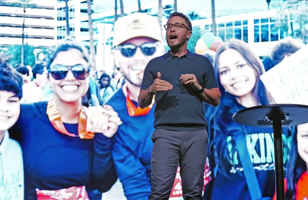 Phoenix Bible Church pastor Tim Birdwell shows a picture of his family during Monday's Chapel at Global Credit Union Arena. March 23, 2026 -