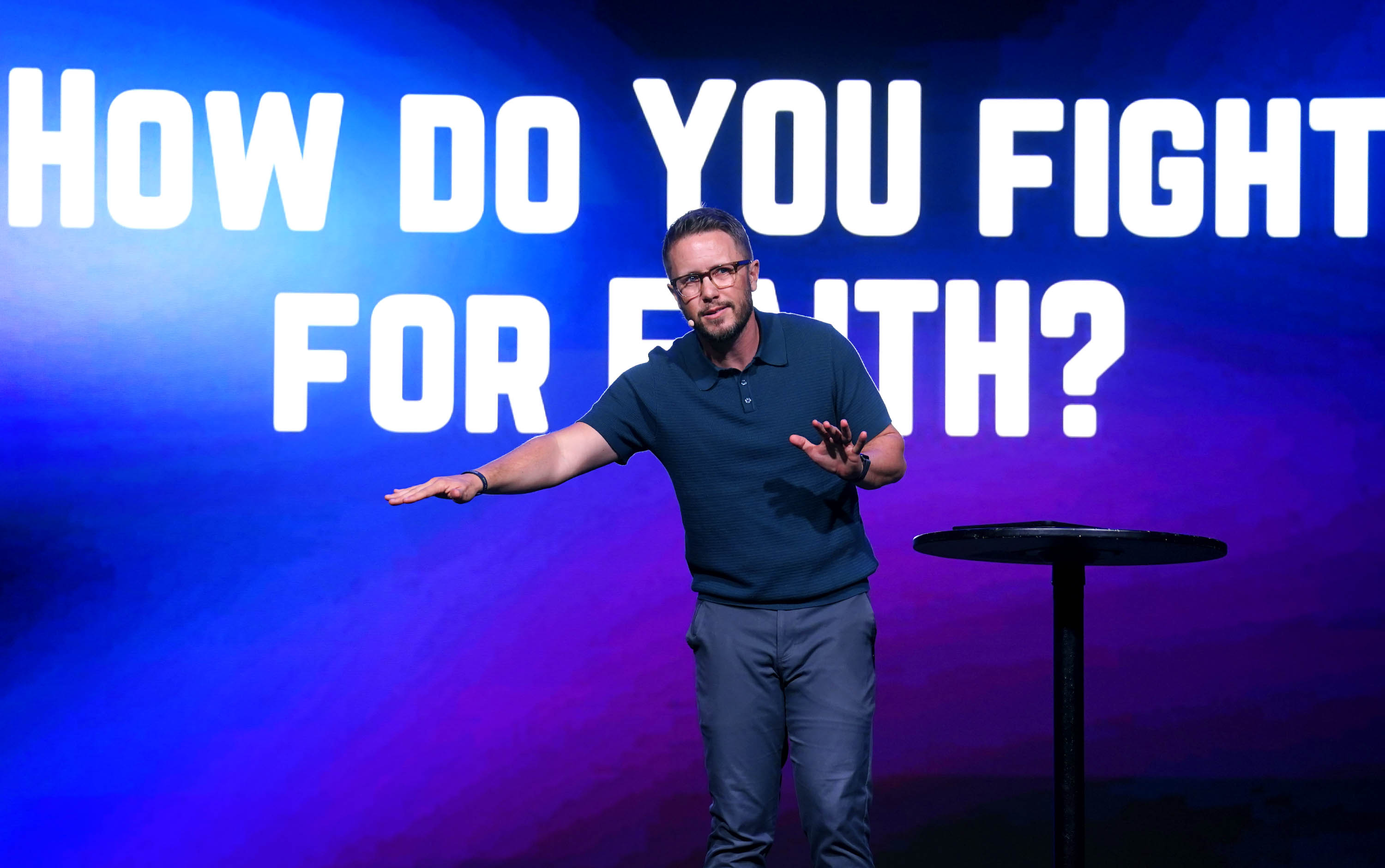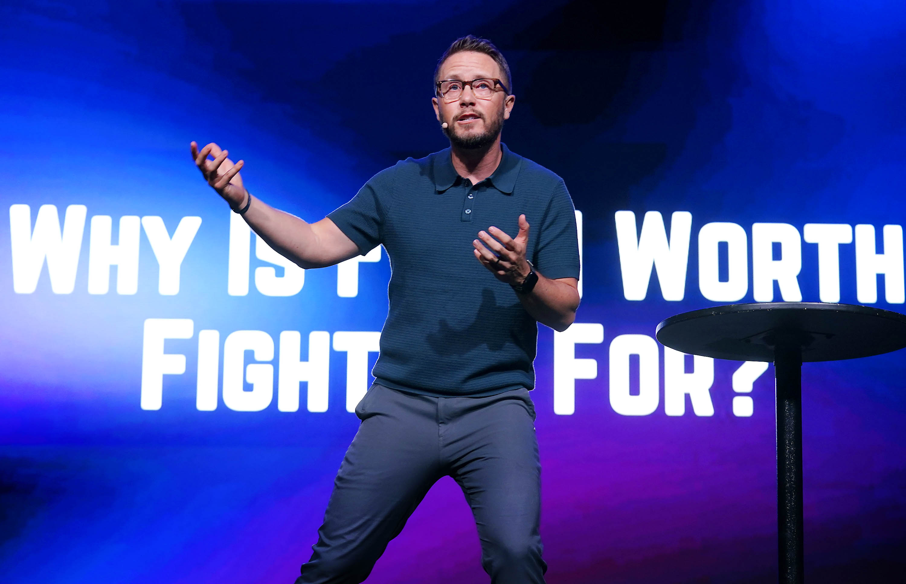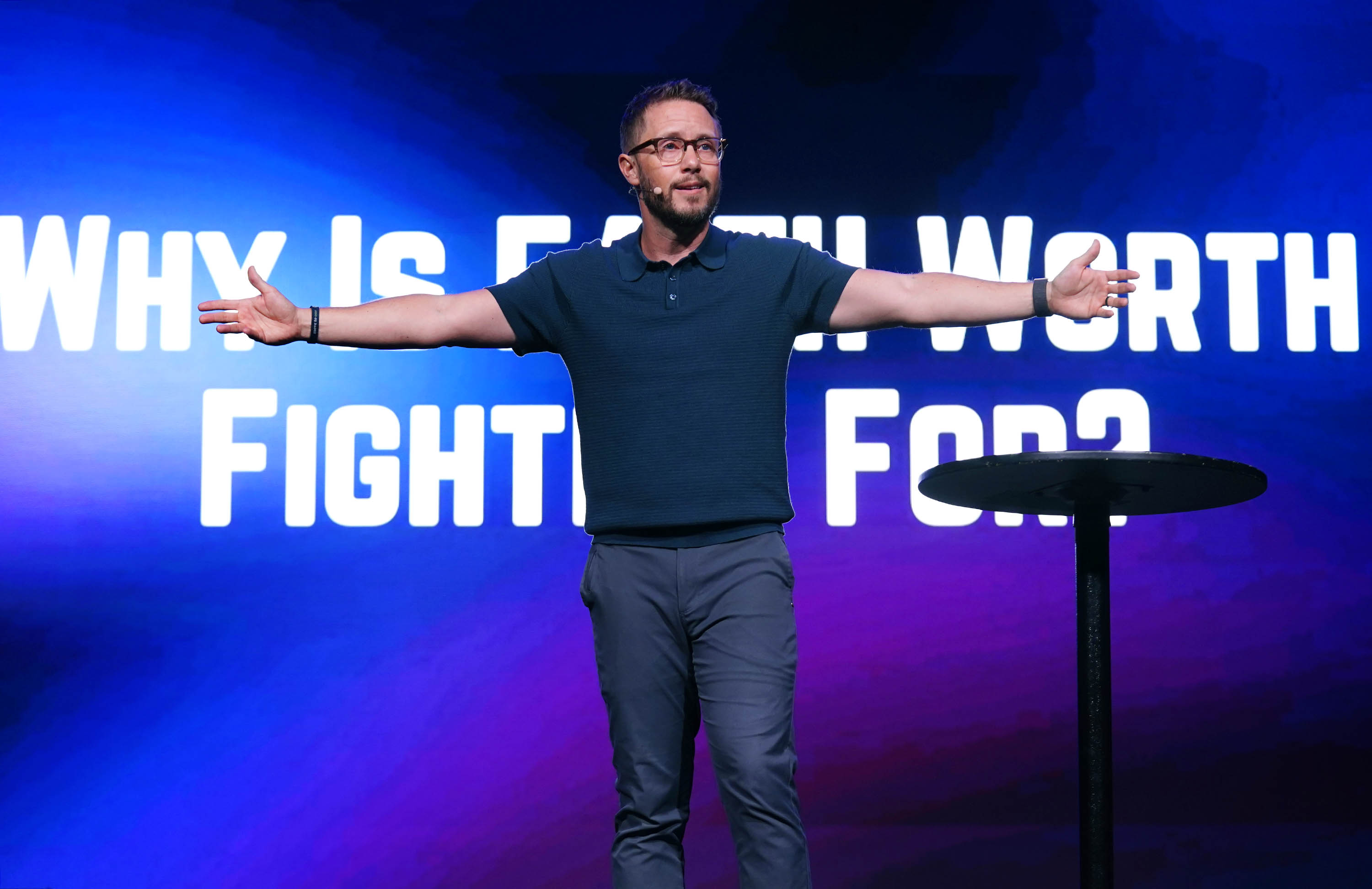 Phoenix Bible Church pastor Tim Birdwell poses the question “Why Is Faith Worth Fighting For?” during Monday's Chapel at Global Credit Union Arena. March 23, 2026 -