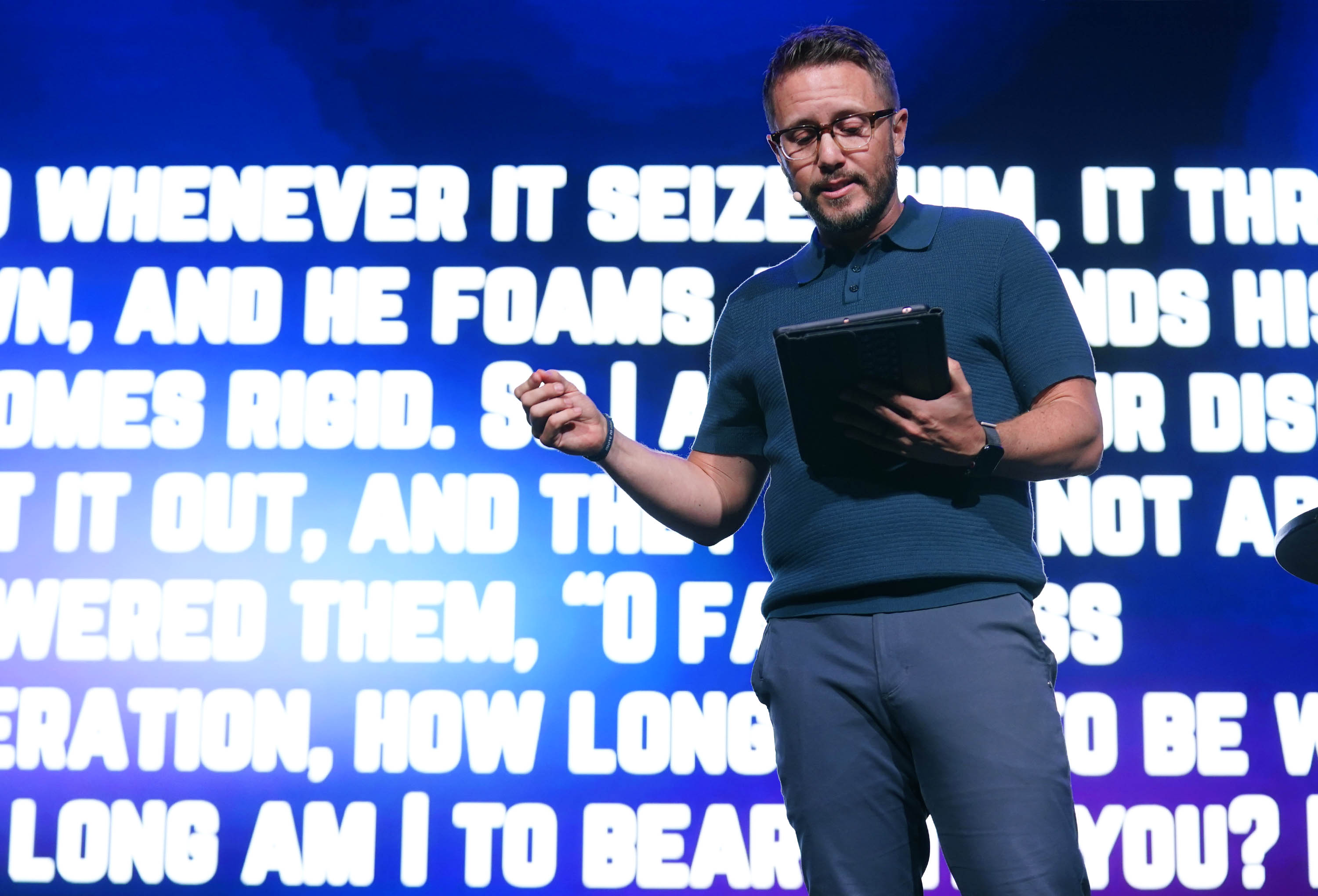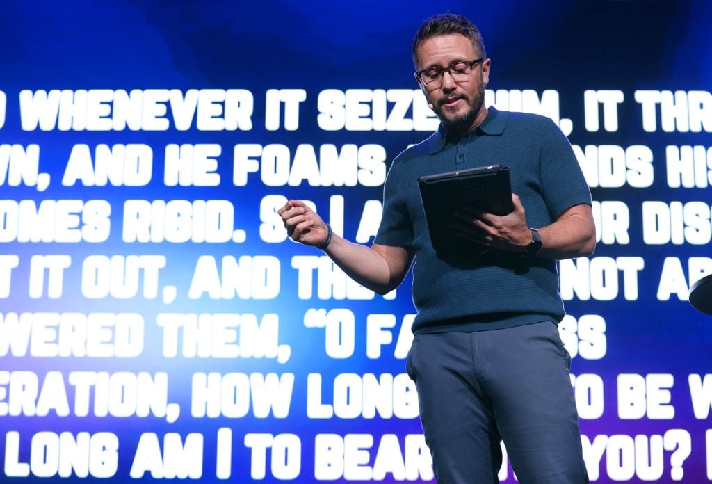 Phoenix Bible Church pastor Tim Birdwell references a passage from Mark 9:14-29 during Chapel at Global Credit Union Arena. March 23, 2026 -