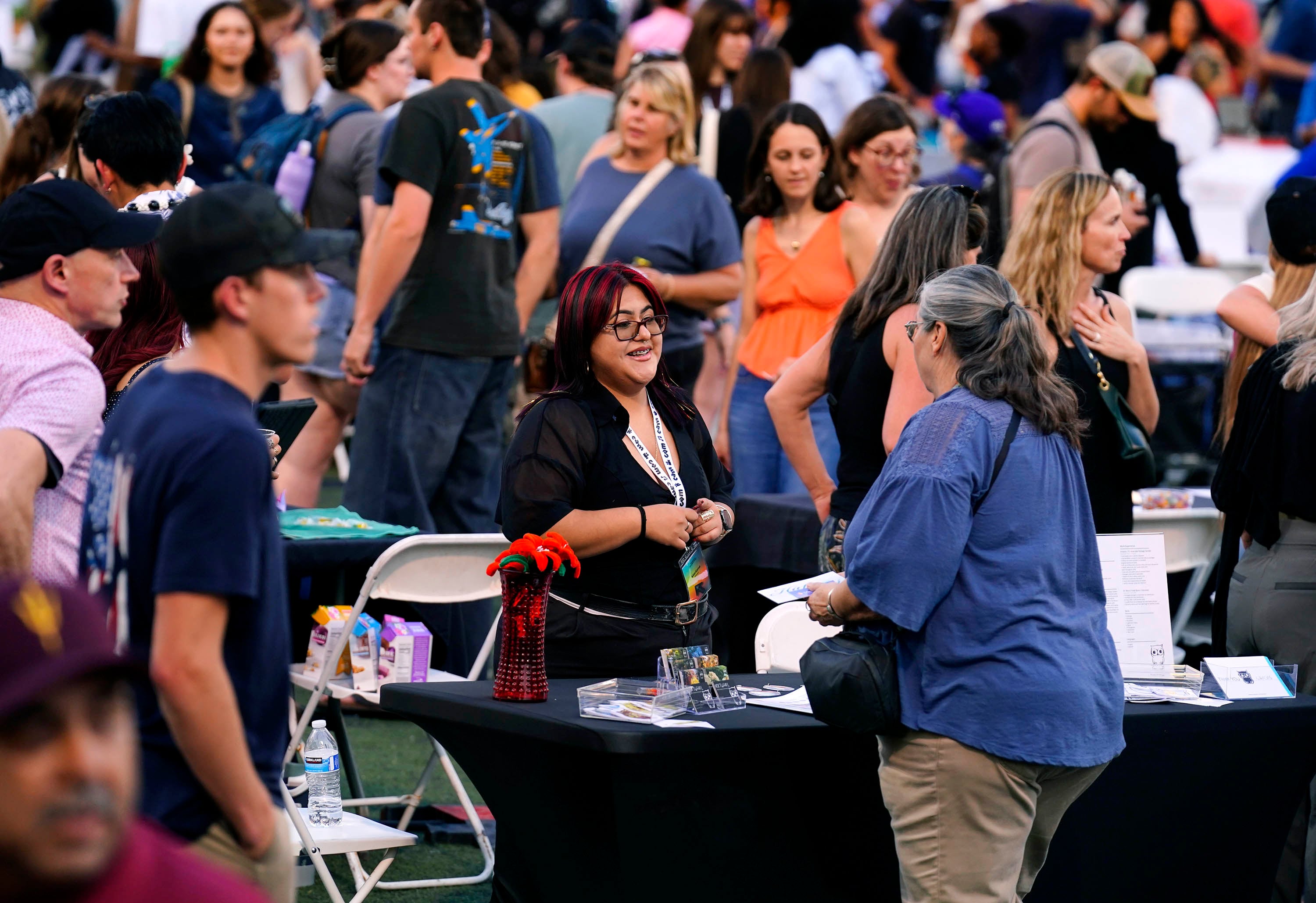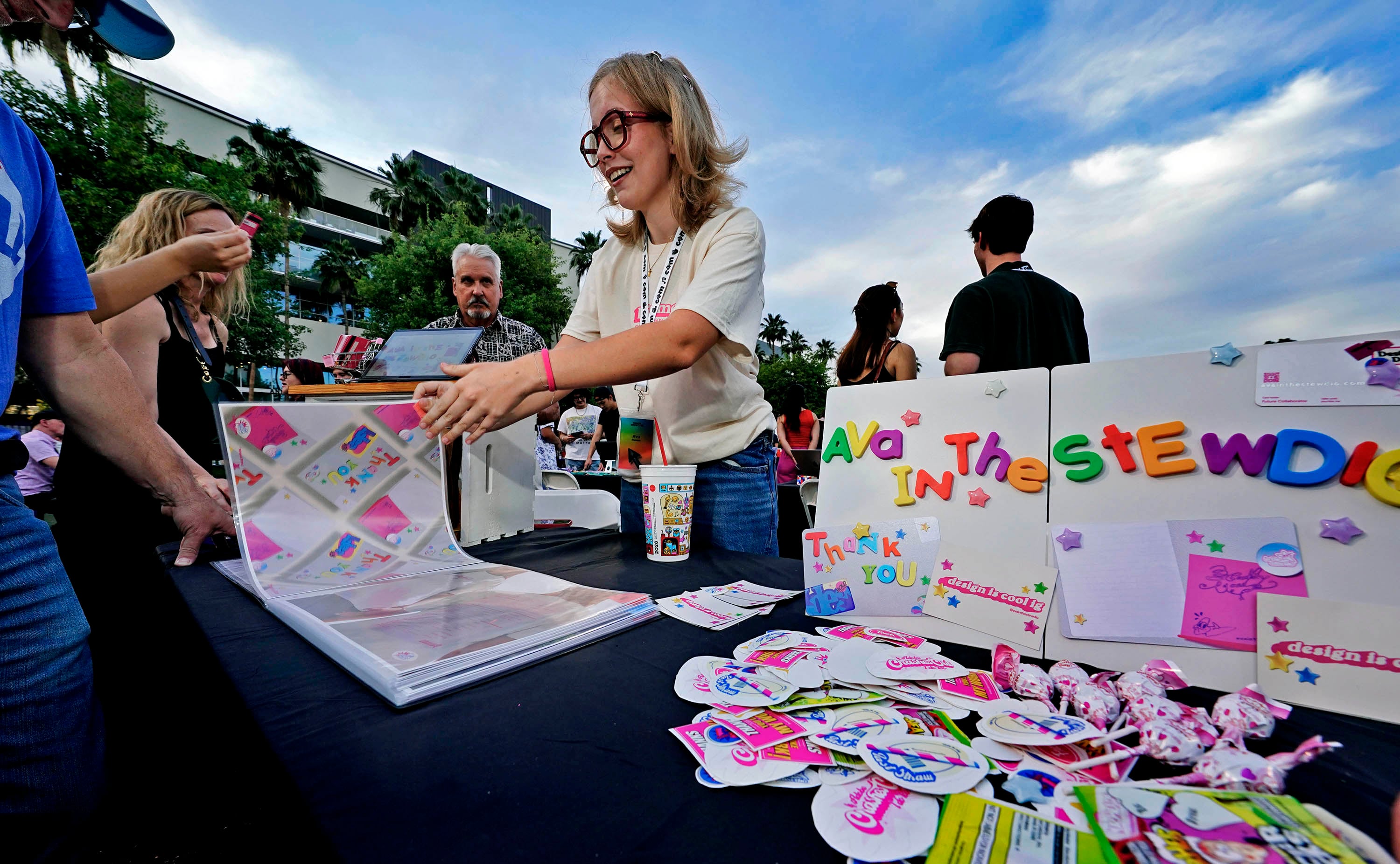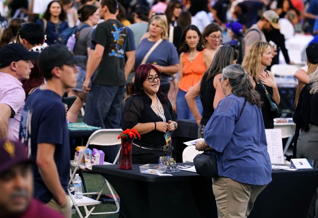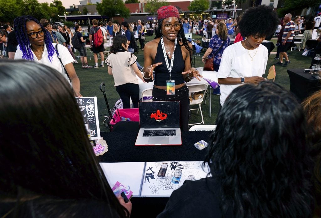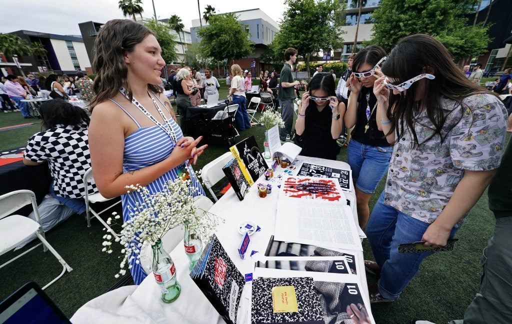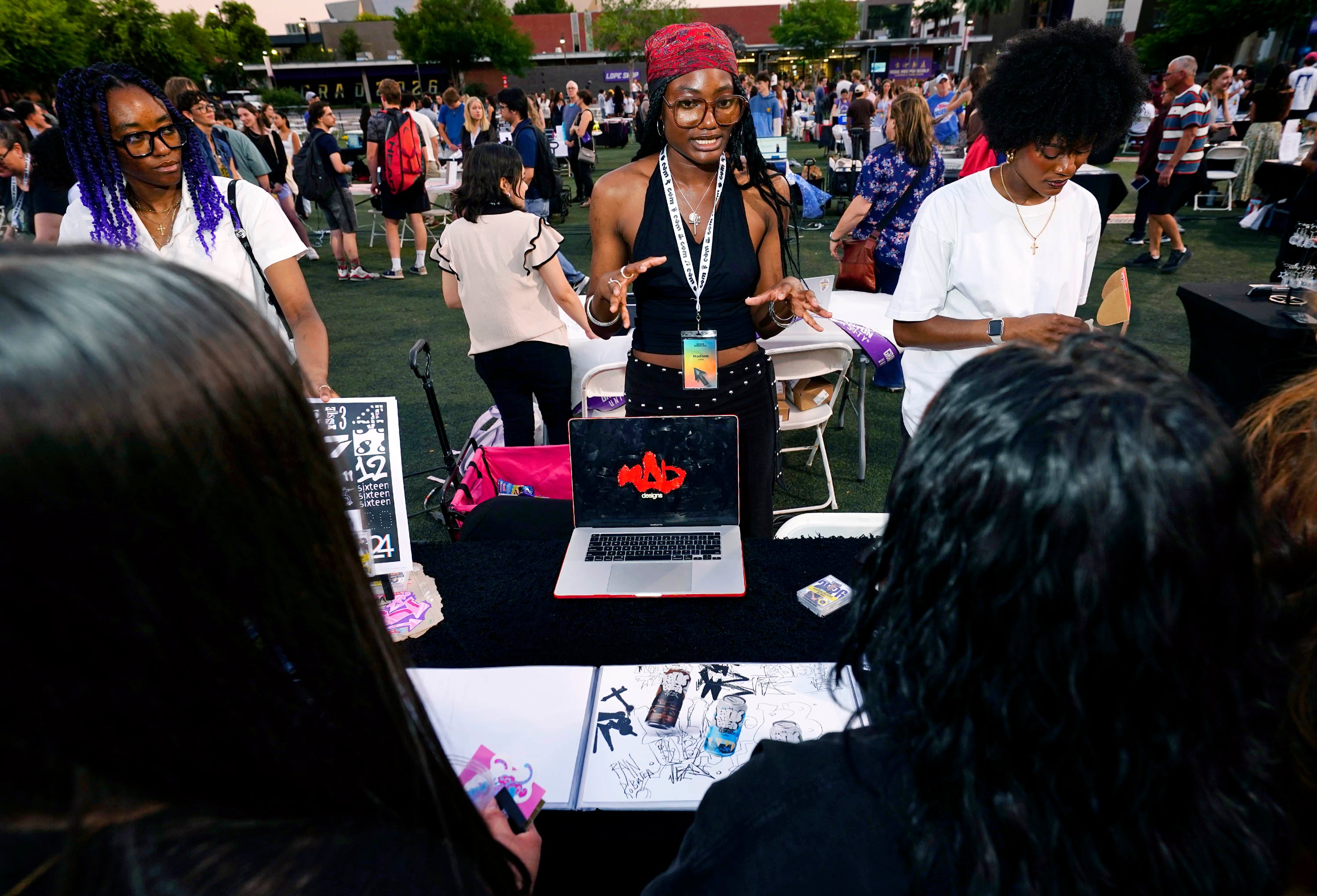 Visitors to Tabyana Jennings' table view some of her work through 3D glasses during the College of Arts and Media Showcase at Prescott Field on April 21, 2026. -