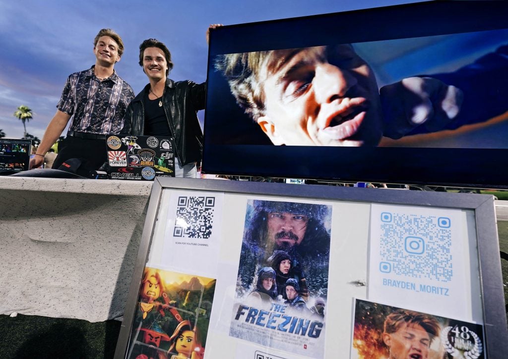 Film students Brayden Moritz (right) and Kevin Reddell screen one of their movies during the College of Arts and Media Showcase at Prescott Field on April 21, 2026. -