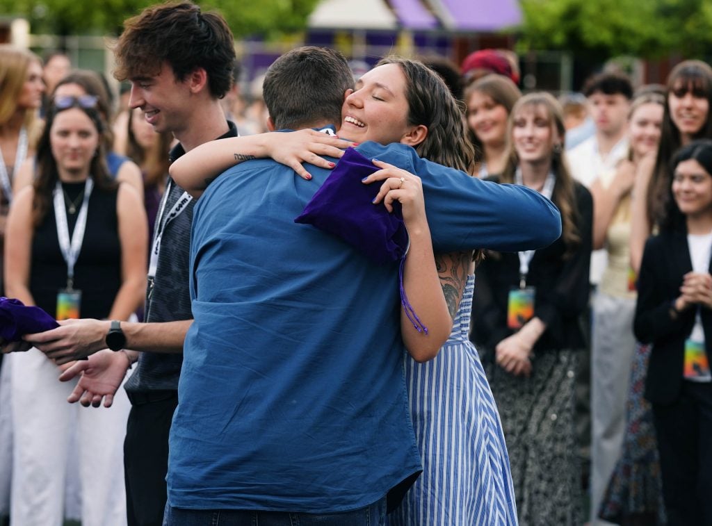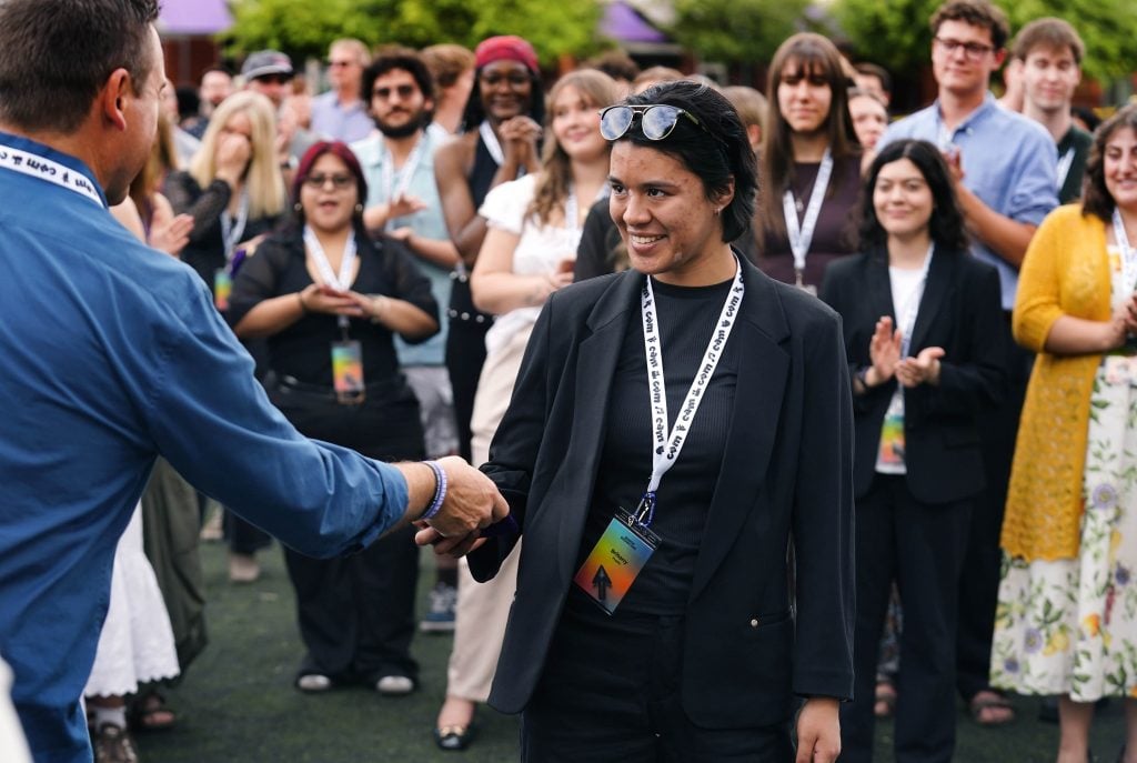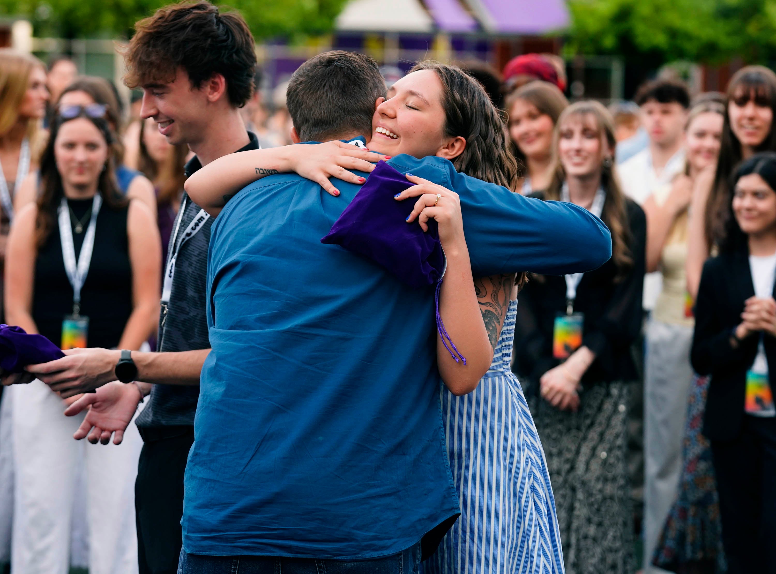 Tabyana Jennings is congratulated after receiving an award during the College of Arts and Media Showcase at Prescott Field on April 21, 2026. -
