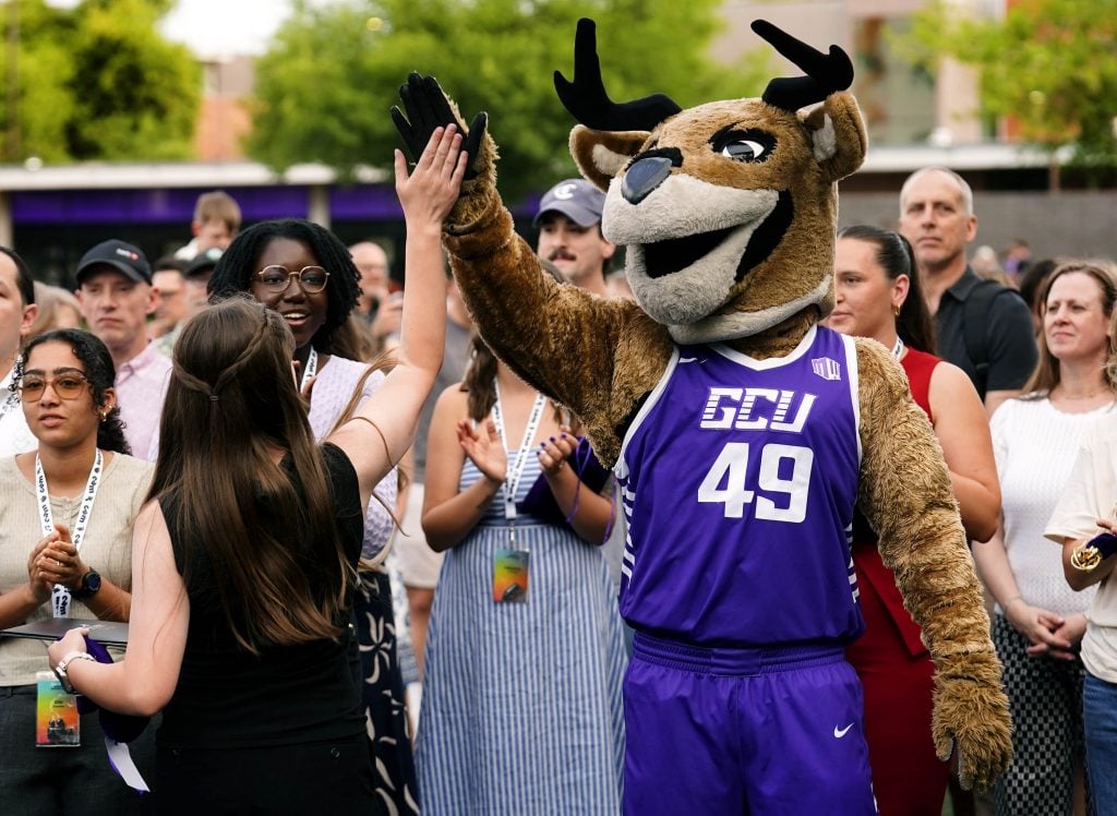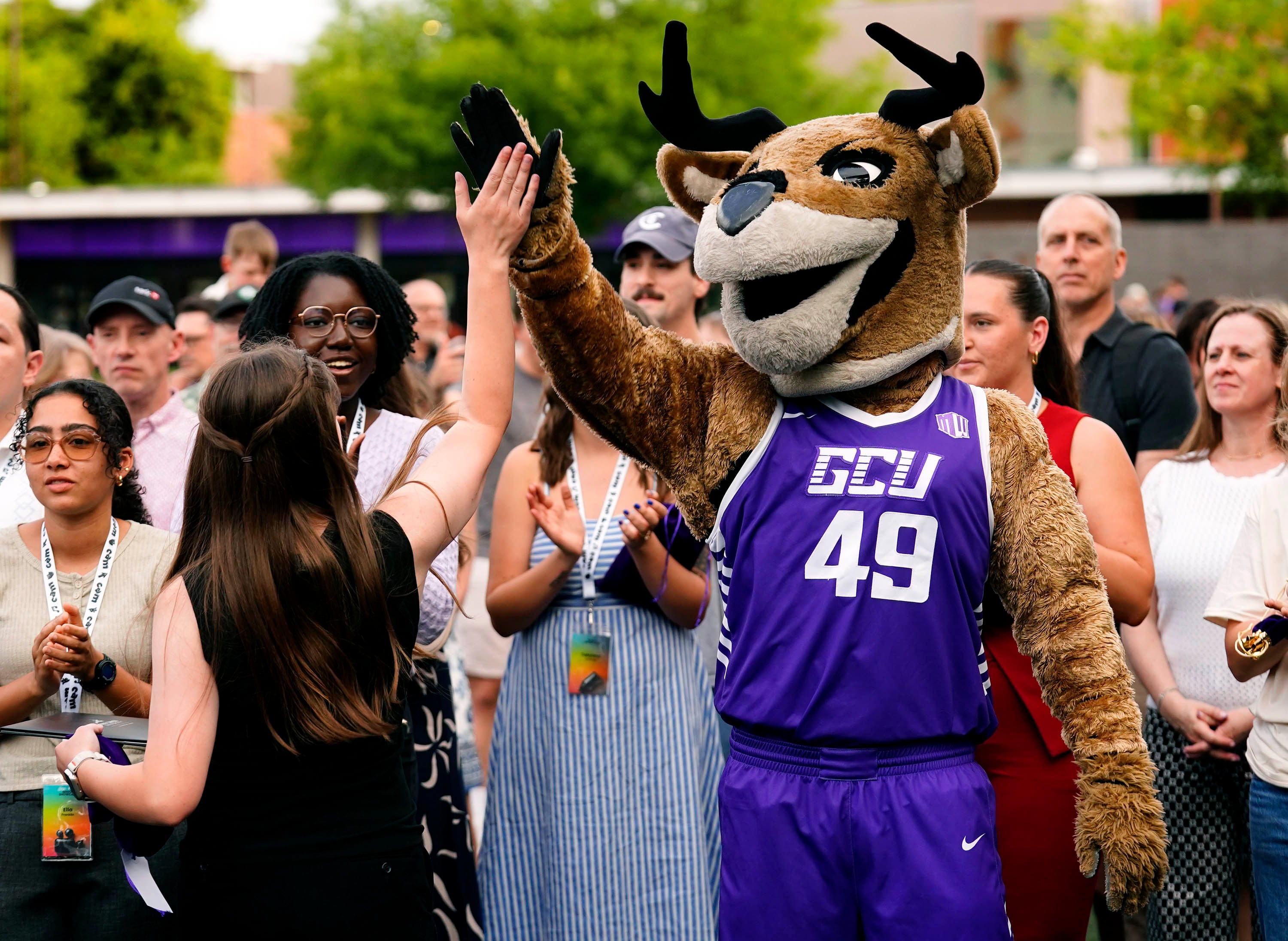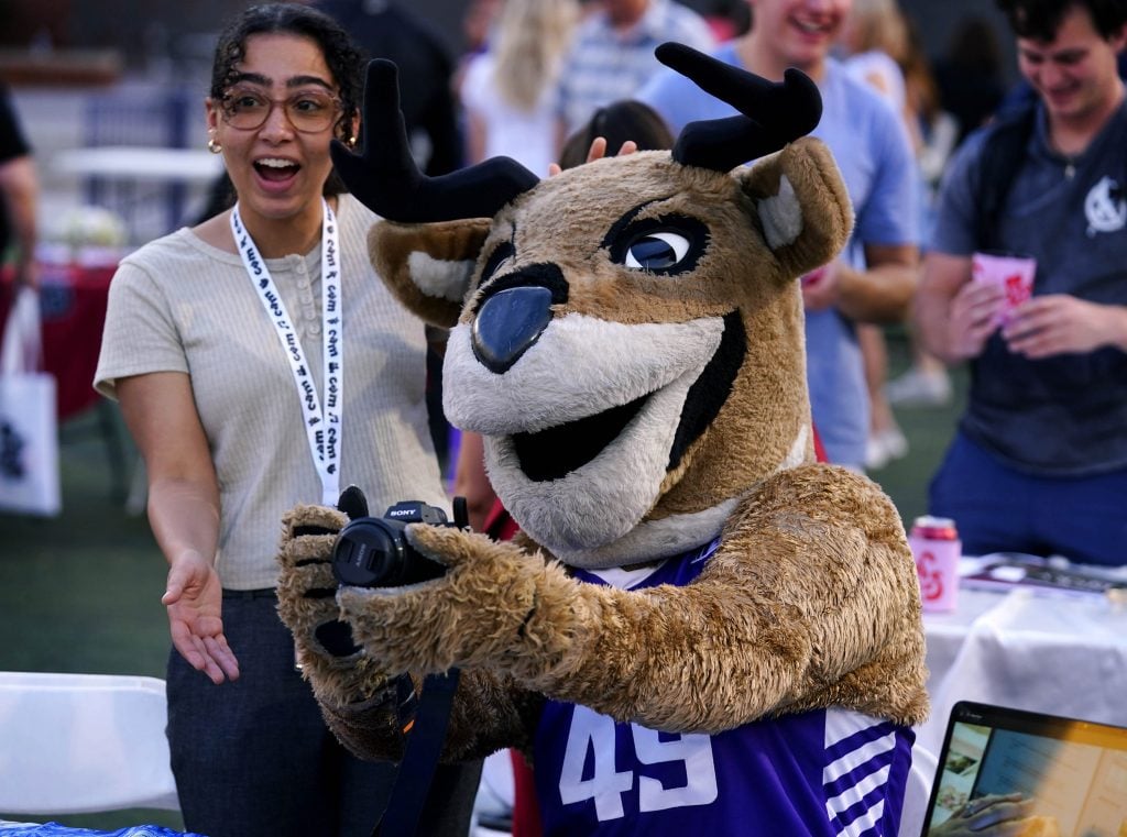 Thunder high-fives a student after she receives an award during the College of Arts and Media Showcase at Prescott Field on April 21, 2026. -