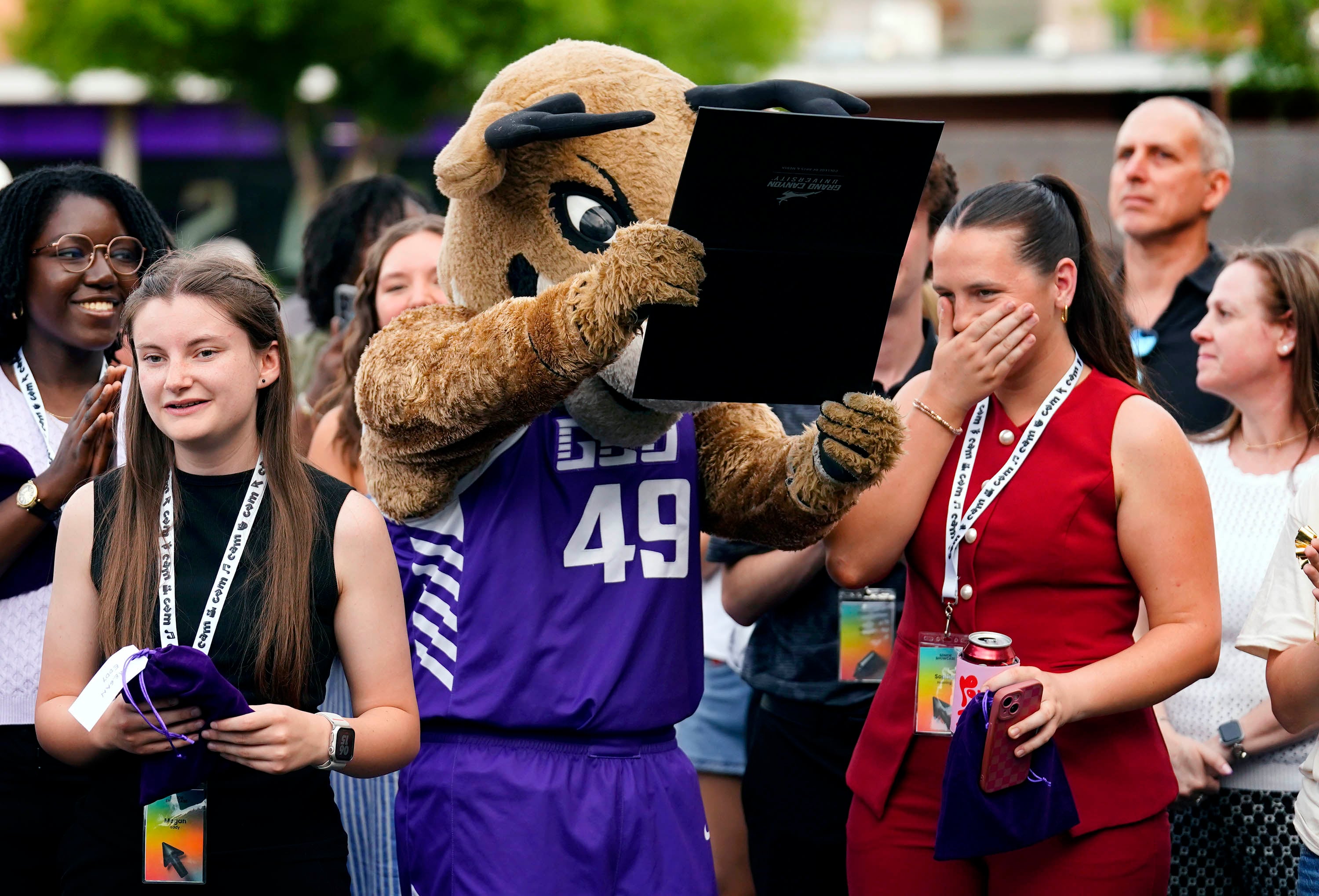 Thunder inspects the award of Sophia Henning (right) during the College of Arts and Media Showcase at Prescott Field on April 21, 2026. -