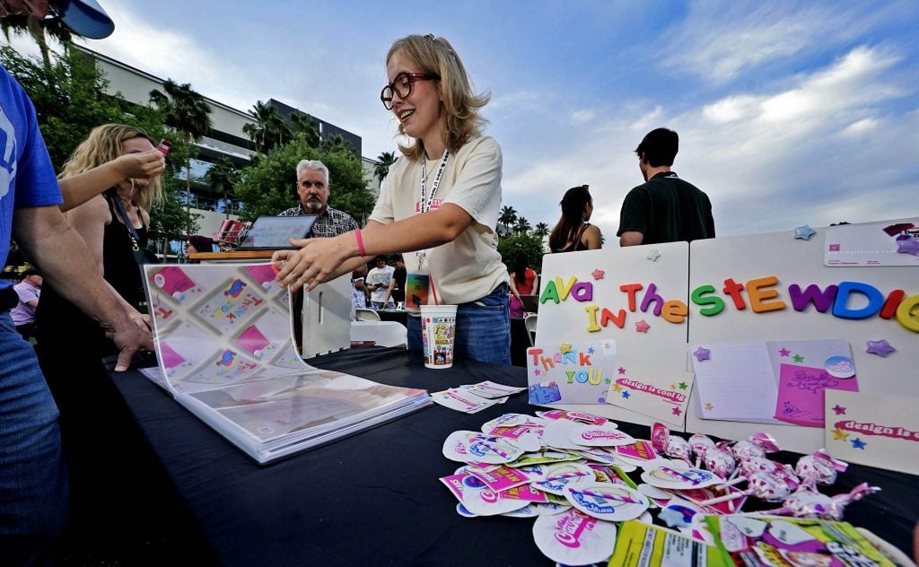 Senior Ava Stewart shares her work during the College of Arts and Media Showcase at Prescott Field on April 21, 2026. -