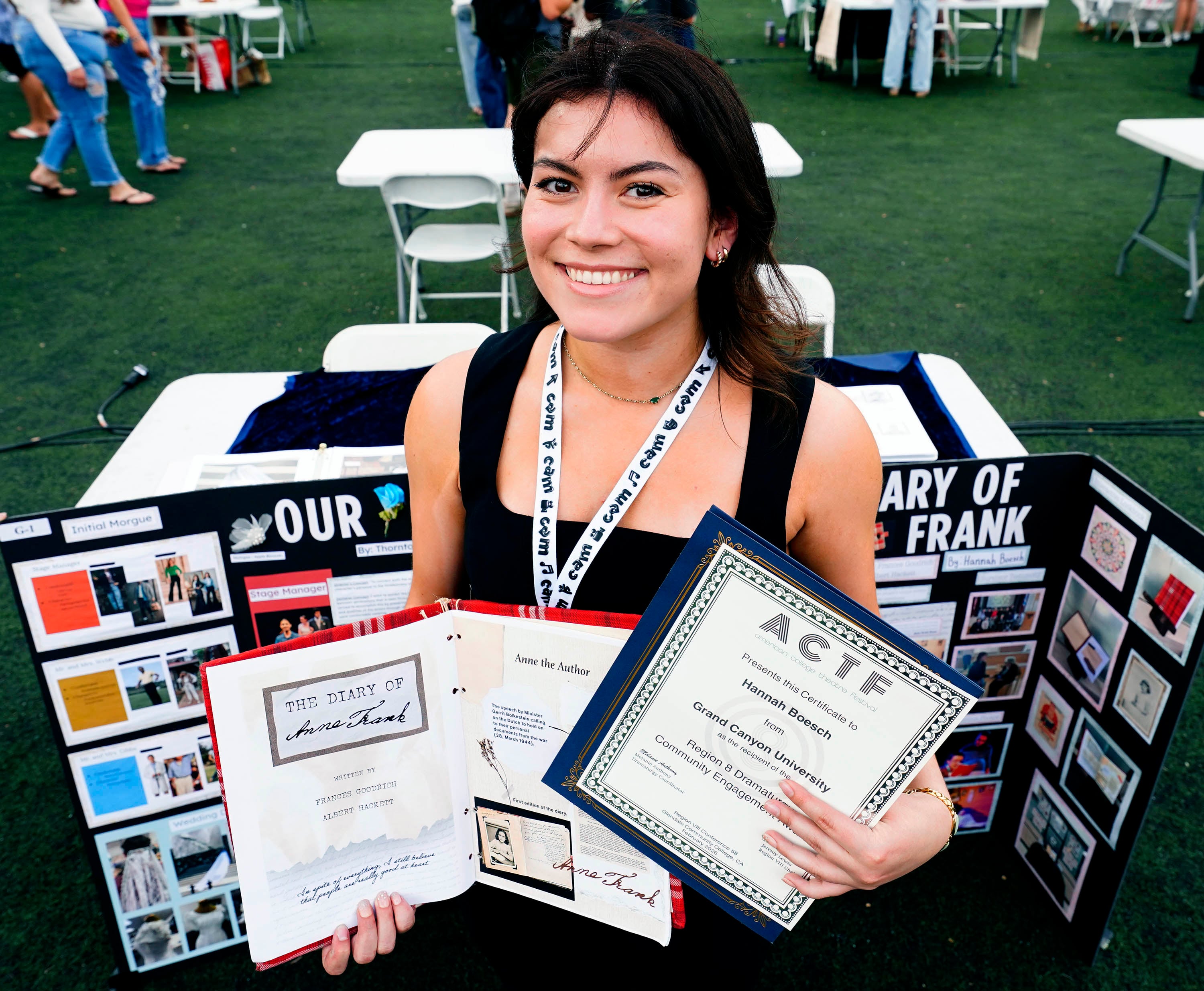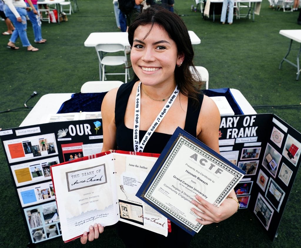 Hannah Boesch displays her certificate for her work on the production of “The Diary of Anne Frank” during the College of Arts and Media Showcase at Prescott Field on April 21, 2026. -