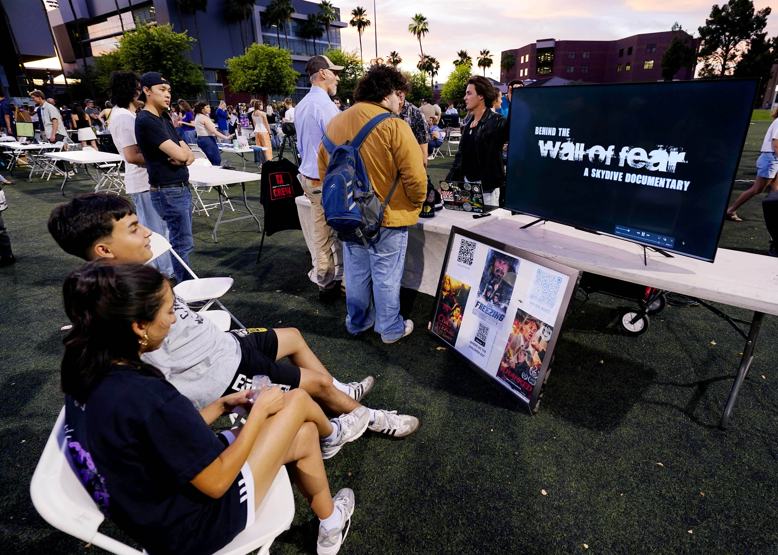 Students watch some of the documentary films of Brayden Moritz during the College of Arts and Media Showcase at Prescott Field on April 21, 2026.