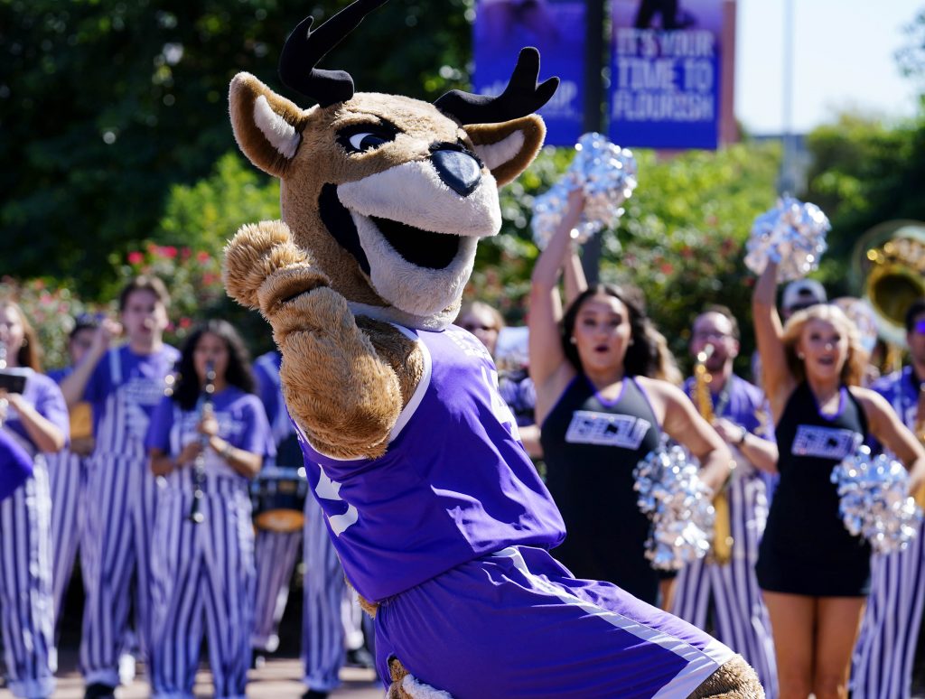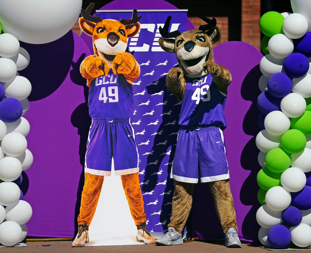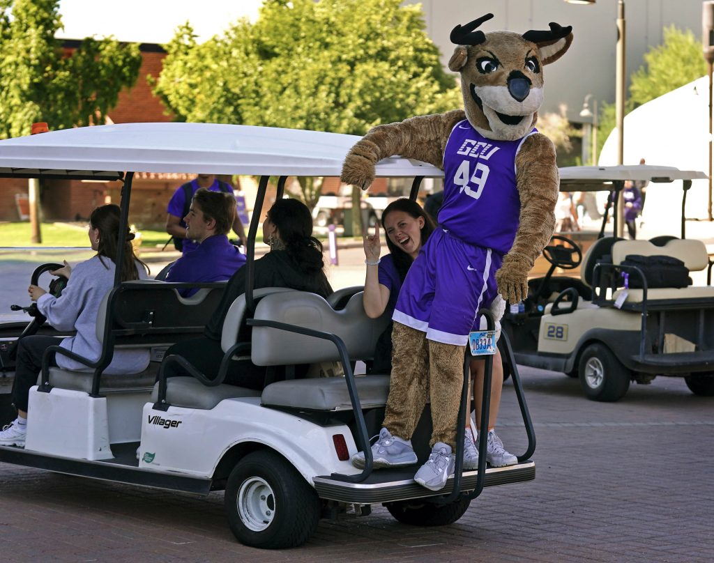 Thunder leads the Thundering Herd Pep Band and GCU Cheer and Dance squads as they perform on the Promenade during Day of Giving festivities on Oct. 23, 2025. -
