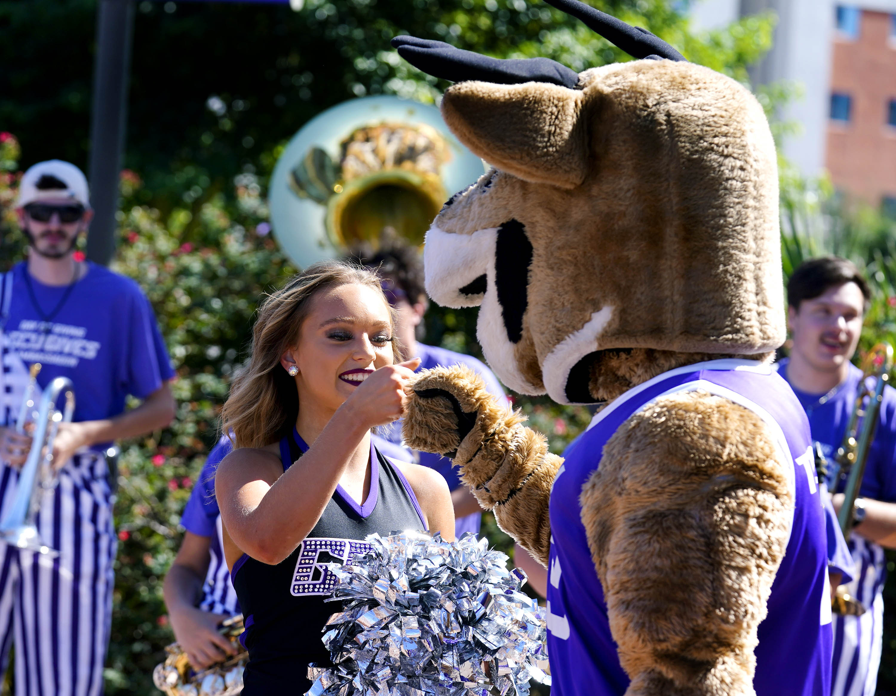 Thunder fist bumps a GCU Dance team member during Day of Giving festivities on the Promenade on Oct. 23, 2025. -