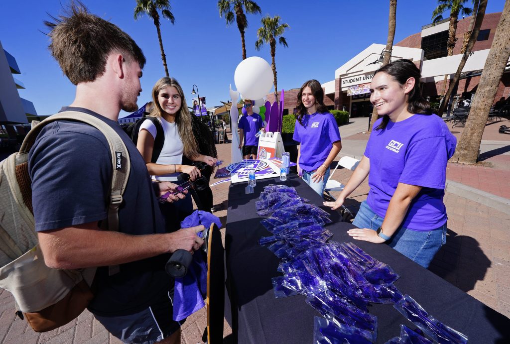 Alumni Relations student volunteers register fellow students to become student ambassadors at one of the Day of Giving stations along the Promenade on Oct. 23, 2025. -