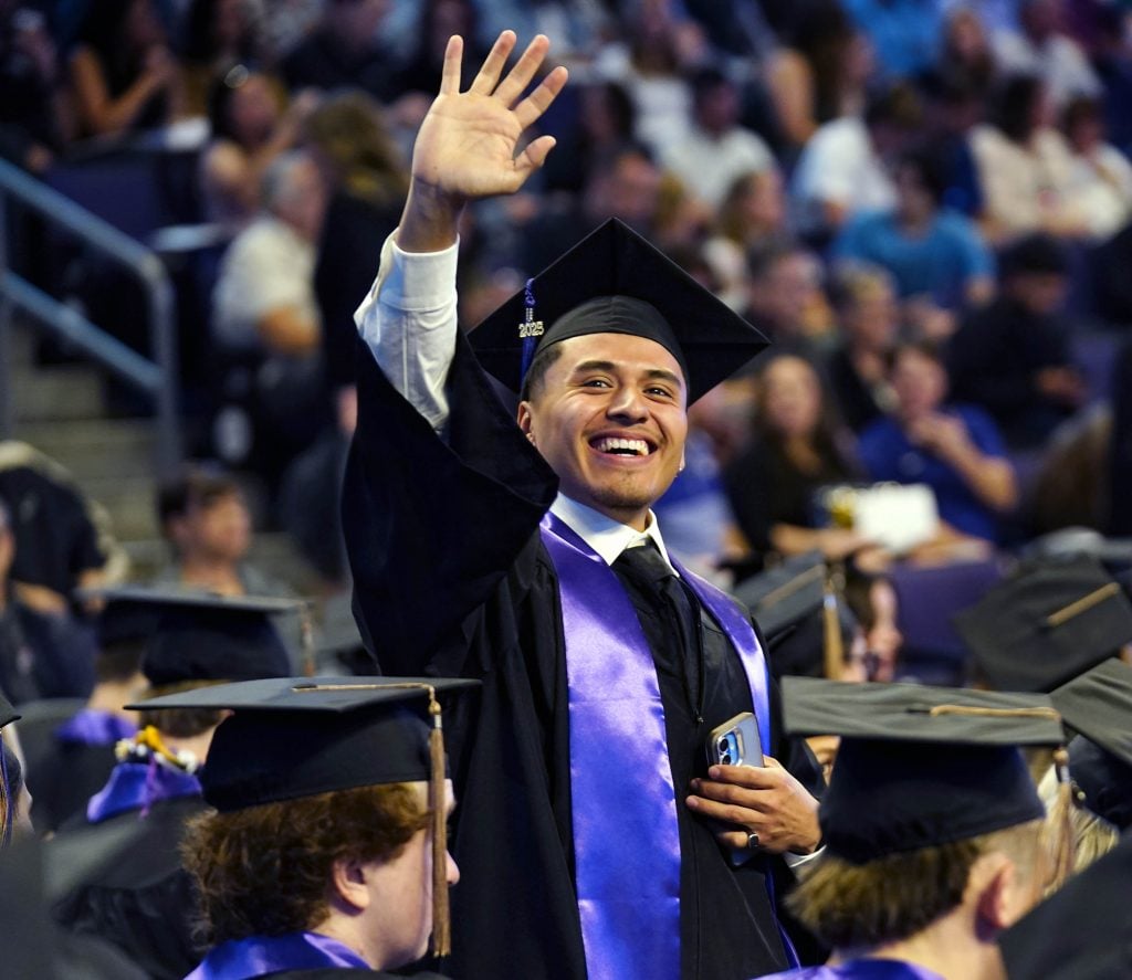 A graduate acknowledges family after receiving his diploma during Friday morning’s winter commencement ceremony on Dec. 12, 2025. -