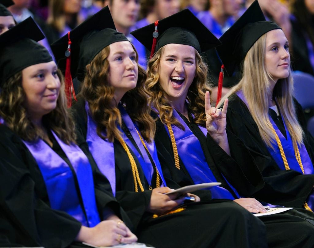 Graduates yell out a celebratory “chee hoo” with friends and family following Friday morning’s winter commencement ceremony at Global Credit Union Arena on Dec. 12, 2025.