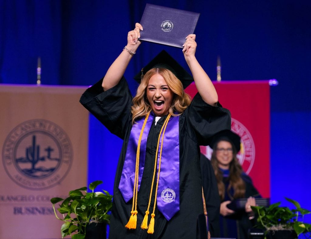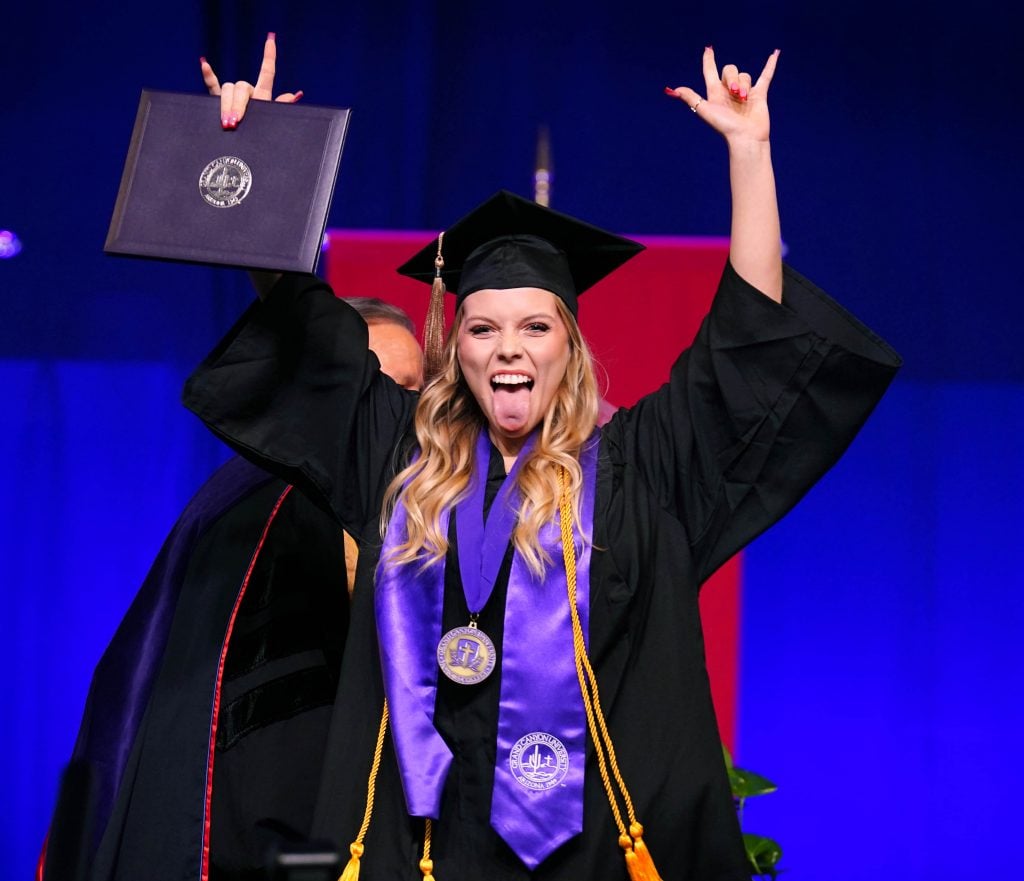 Former ASGCU student body president Ashley Cote celebrates after receiving her diploma during Friday morning’s winter commencement ceremony on Dec. 12, 2025. -