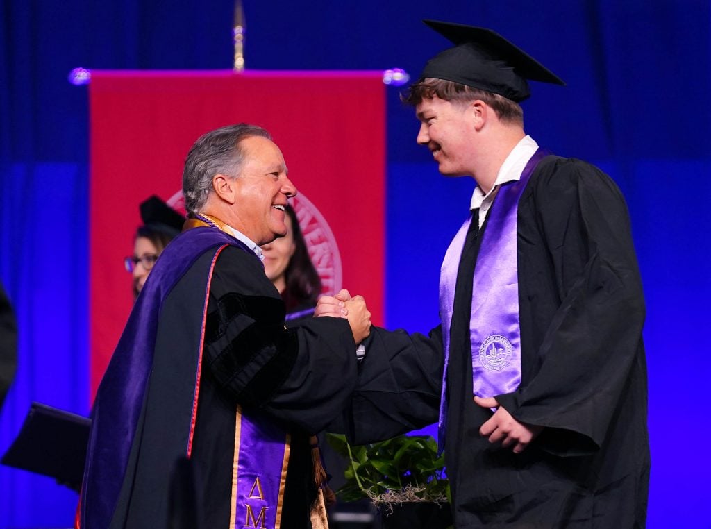 Graduate Troy Edwards is congratulated by Colangelo College of Business Dean John Kaites during Friday morning’s winter commencement ceremony at Global Credit Union Arena on Dec. 12, 2025. -