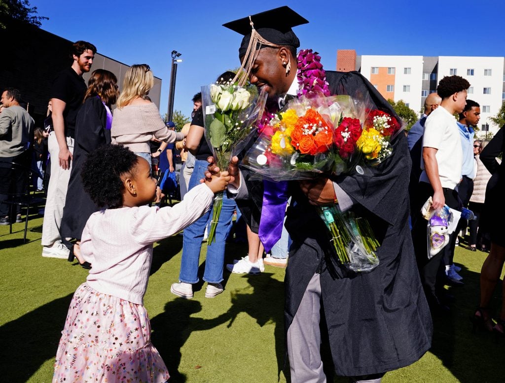 A graduate is given flowers by his niece following Friday morning’s winter commencement ceremony at Global Credit Union Arena on Dec. 12, 2025. -